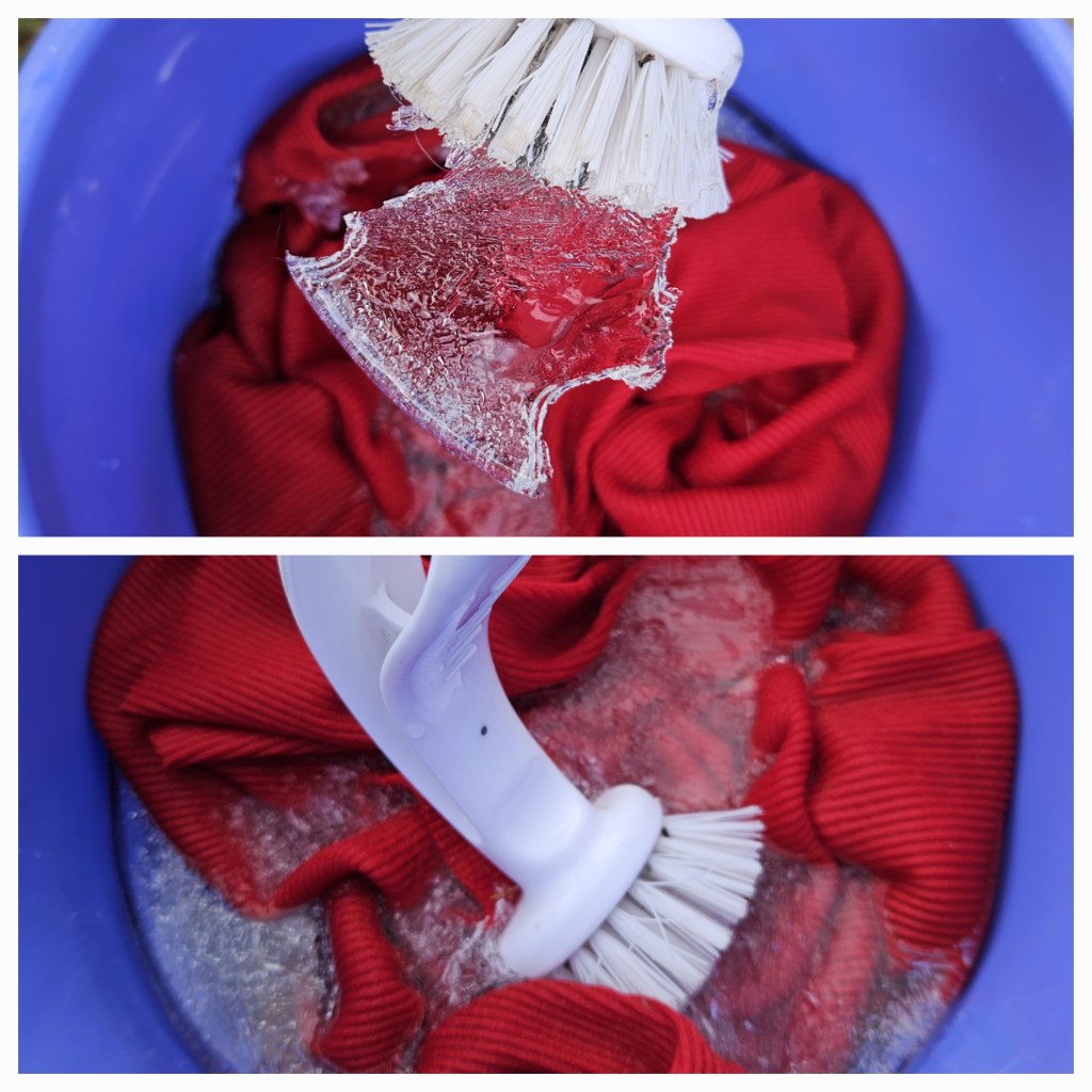 Frost on the ground this morning and ice in the washing bucket! The minimum overnight temperature was -2°C. I left a seat cushion cover soaking overnight. When I lifted the brush, the seat cover came up as a frozen lump.