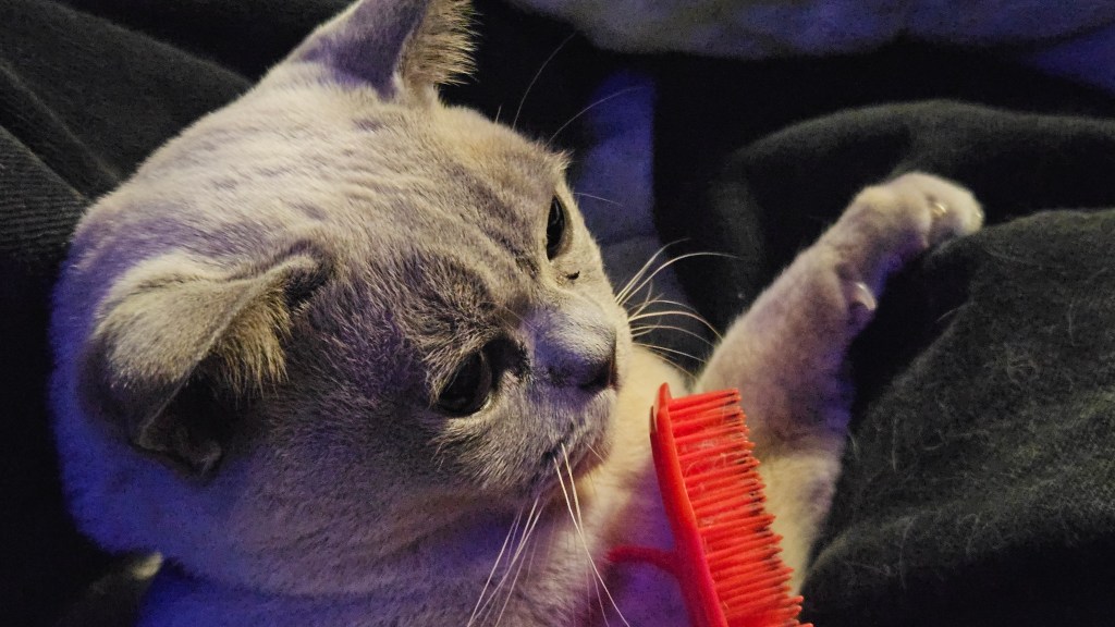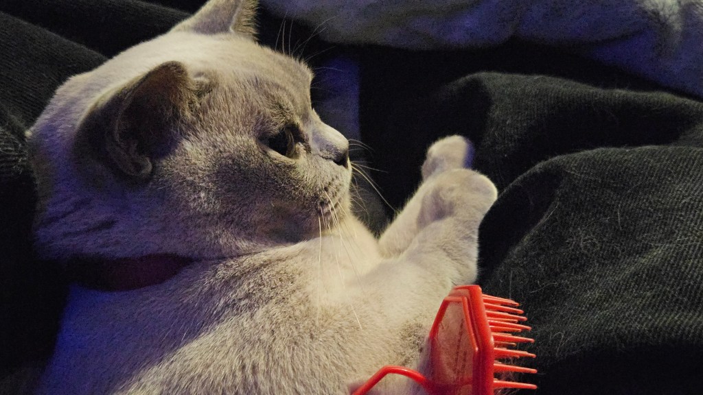 Tilly wanted to be brushed while lying on my lap near Bluey, then she played with the brush.