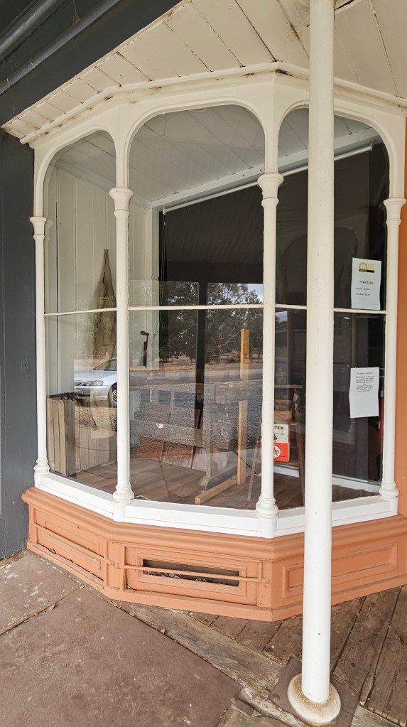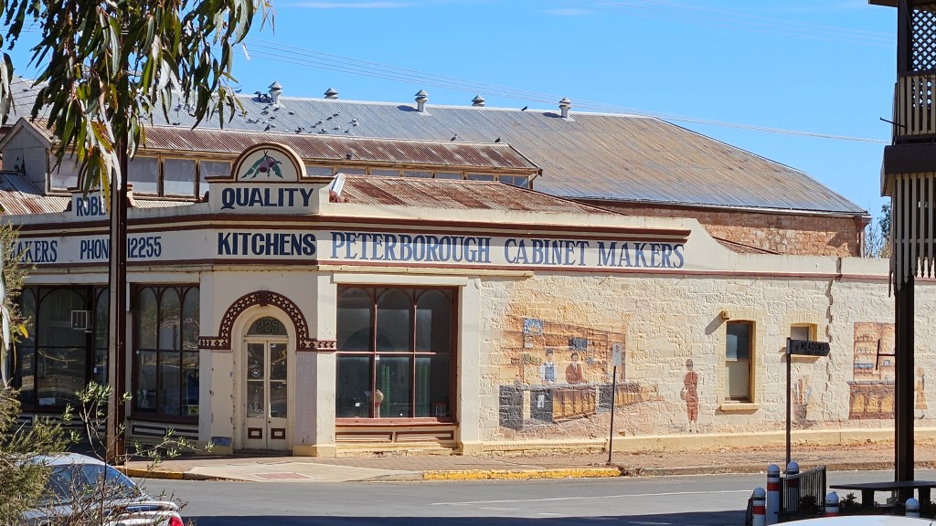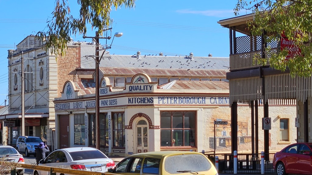 After yummy banana hotcakes, we farewelled our hosts and our friends, then headed to our first pit stop at Peterborough. We just propped in the main street, which doesn’t seem to have changed since any of our previous trips through this old railway town. The two storey Railway Hotel is on the opposite corner to the cabinet maker’s shop, which has been permanently closed. There is an entrance to the hotel on the corner under the roof turret with the wonky weather vane.