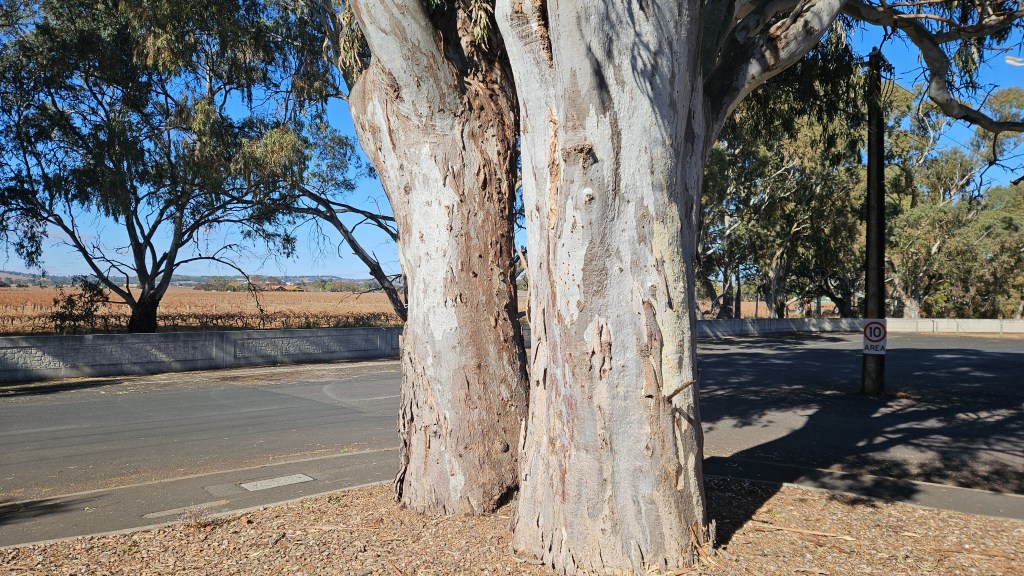 We walked from the caravan park to Barista Sista for coffee and sourdough fruit toast. I walked Bluey back to get the car as Anita did more shopping. Park Ave runs between the rear of the shops and North Para River. Vines grow the other side of the river, and on Park Ave I was impressed by these two grand gum trees. The concrete levee bank is designed to protect Nuriootpa from 1 in 100 year flood events. Demountable flood barriers are used in other parts of the town.