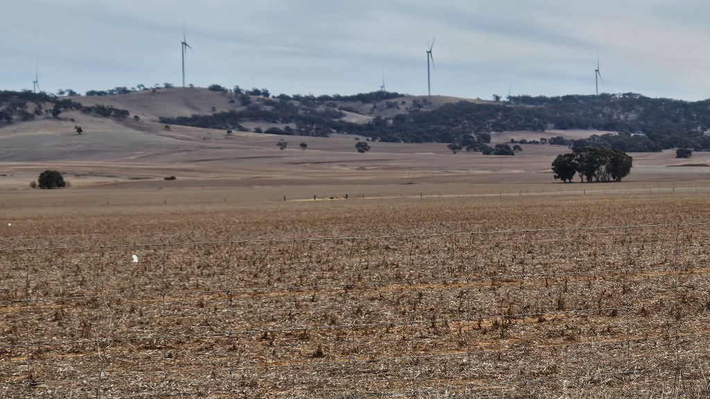 Soon after we drove onto RM Williams Way, we found ourselves behind an oversize truck. Oncoming vehicles had to stop on the verge to allow the wide truck to pass. There was a pilot vehicle ahead, but no following safety vehicle. We could not overtake, so I dropped back to avoid the inevitable dust. We stopped for a break at a roadside picnic table to allow the truck to get ahead. We could see a wind farm in the distance to the west, and paddocks to the east waiting for rain before they can be sown with wheat.