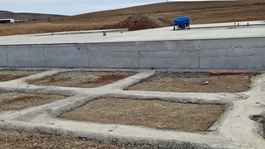 The property has a house and sheds, but a new house is being built. When this 800mm concrete slab was poured, the concrete works at Whyalla and Port Pirie devoted all their trucks to delivering the concrete to complete the pour in one day.