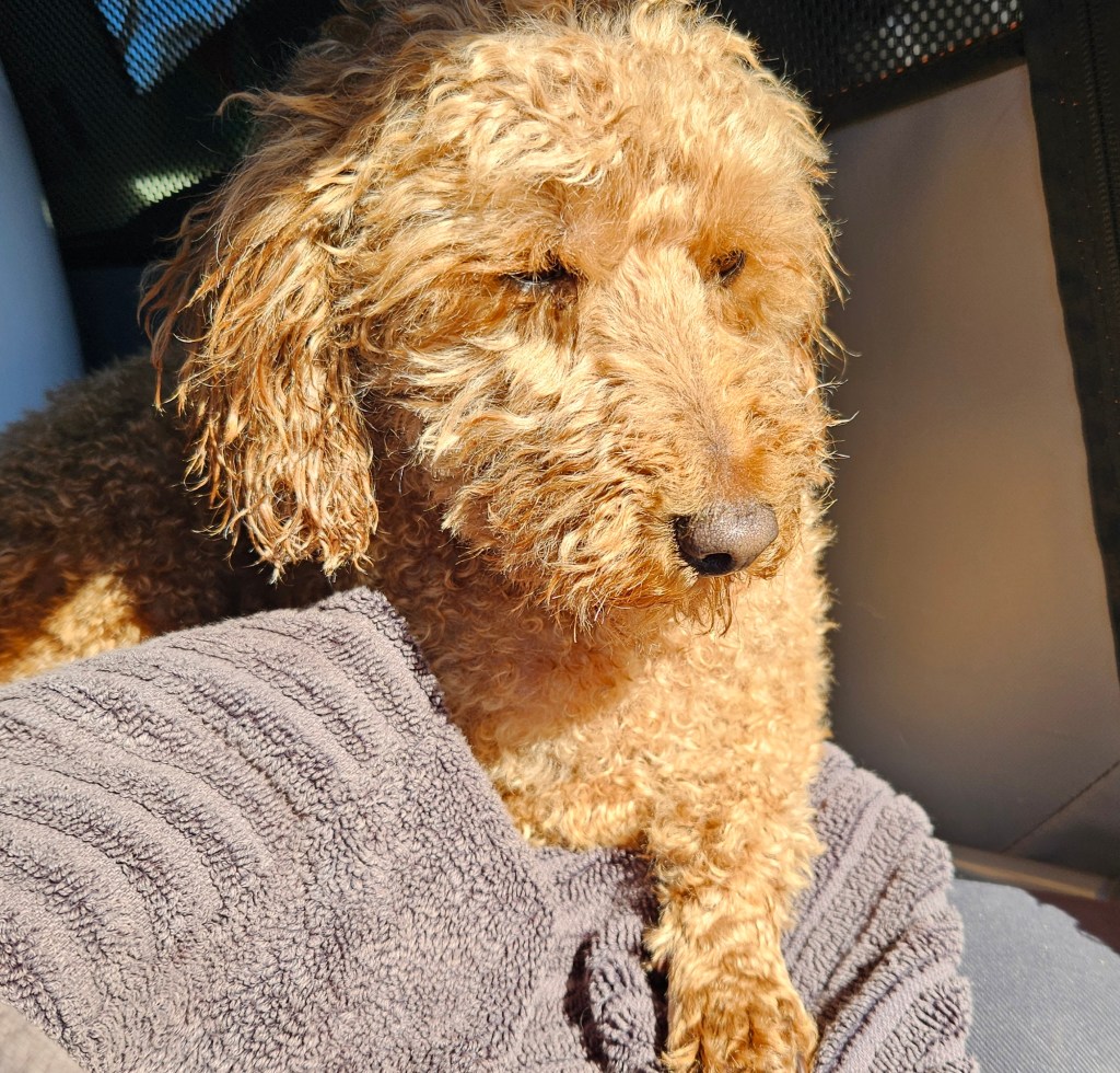 When it was warm enough for T-shirt and shorts, I set up the table and big plastic bucket for Bluey’s bath. After towel drying him, I put him in the car to dry, where it was warm but not hot.