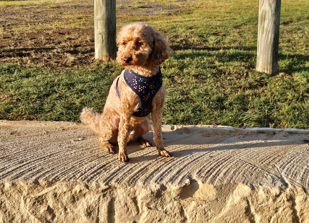 There is an off leash area of parkland just outside the caravan park. Bluey jumped up on the sandstone block to take in his surroundings.