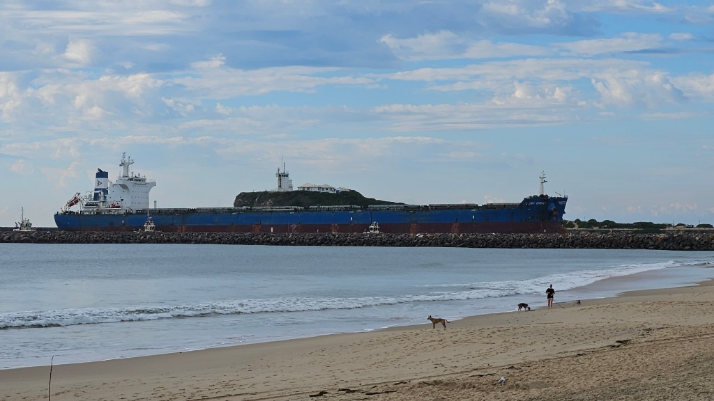 I walked to Lexie’s on the Beach for coffees. While waiting, I noticed some attractive features on the old change rooms, while a ship sailed through the breakwater.
