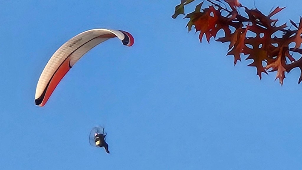 Once we had backed onto our site, I tied Tilly to the outside of the Bushtracker, where she was immediately tormented by a young magpie looking for human food. I took Bluey for a walk around the park, admiring the autumn folliage when I heard this paragliding overhead.