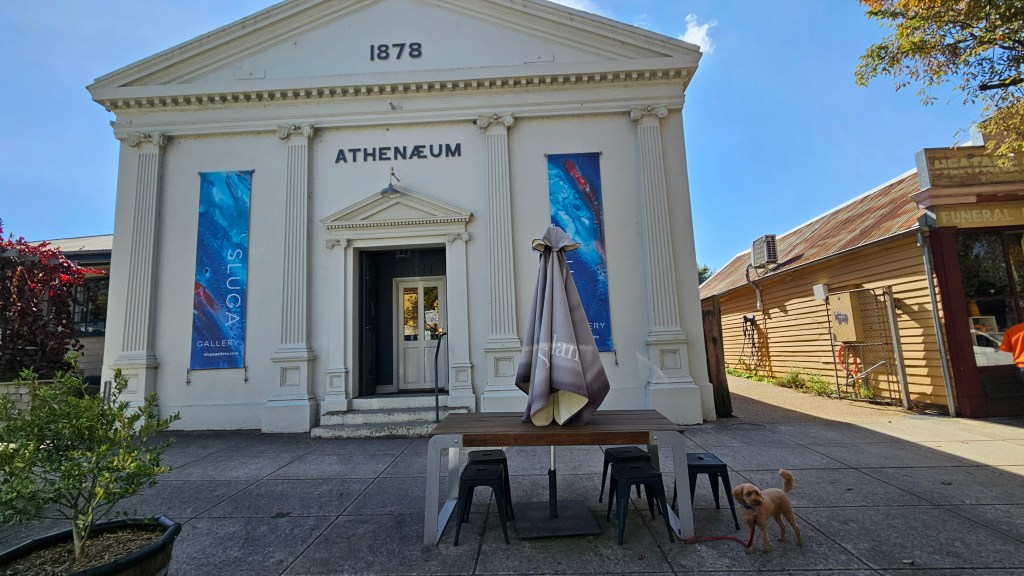 We went to town for a walk and to have lunch at The Produce Store. It was warm enough for us to eat outside with Bluey. The food options were interesting, with offerings not available in most cafes. I had excellent salmon sushi, and Anita had lamb shank and vegetable soup. Bluey sat on his mat under the table, watching lots of dogs stroll by, ranging in size from a chihuahua to a greyhound.