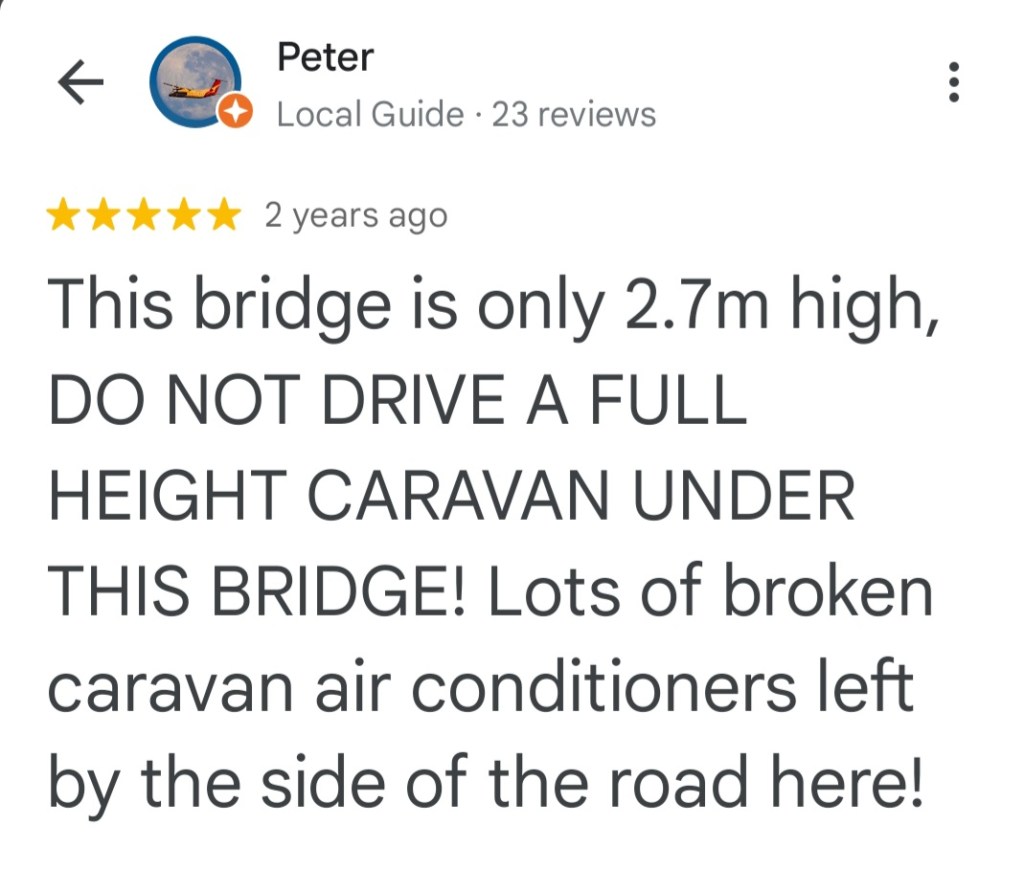 A reviewer has posted photos of debris left by caravans that have been damaged under the bridge and another specific warning. I will contact the Visitor Information Centre to suggest they warn caravanners about this bridge, particularly if, like us, they give directions to the dump site. If we hadn’t made that diversion, we would not have driven near the tunnel.