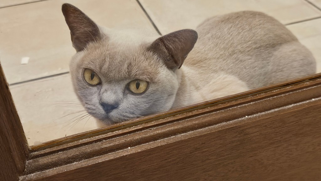 Tilly tested limits by sitting at the dining table. She was on safer ground when on top of the critters’ crate.