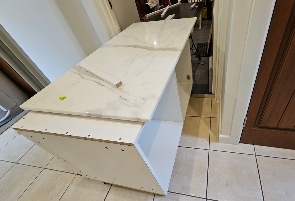I have been working on the cabinet and managed to slide the heavy marble top off its temporary home onto the top of the cabinet. There is a step up from our garage into the house, and this was just the right height to allow me to push it from the table to the cabinet. I locked my apprentice in the laundry during this operation.