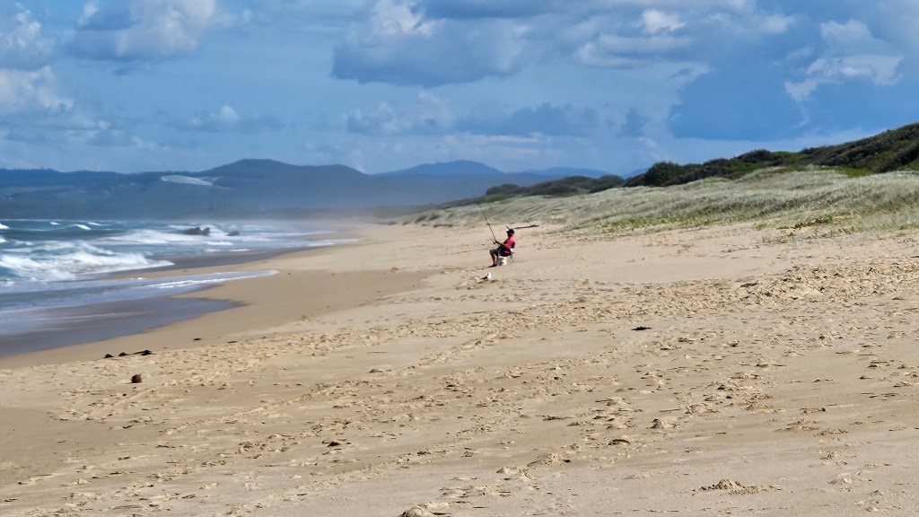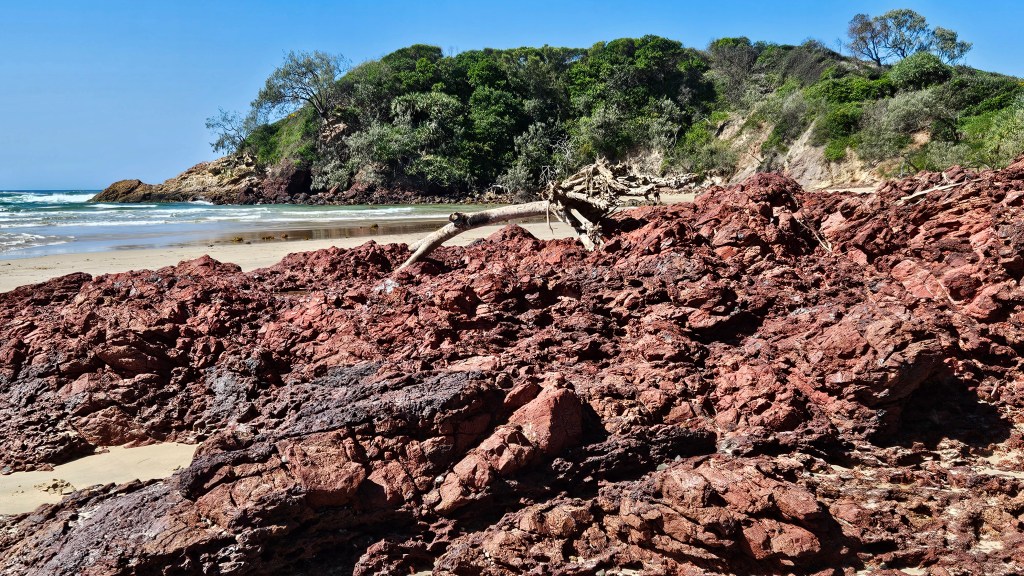 The rocks here are seriously red. We drove to the carpark for Little Beach and walked through to the southern side of Corindi River, where Bluey was allowed. He didn’t want to go swimming!