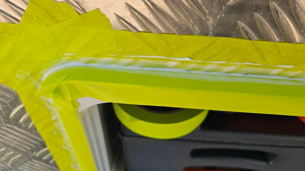 I tackled the minor leak we have around the toilet housing, which allows rain water to end up on the bathroom floor. I have pulled this out before and replaced the silicone, but it ends up being a very thin seal when the housing is screwed back in. This time, I left it in place and put a narrow bead of silicone over the housing and the checkerplate aluminium.