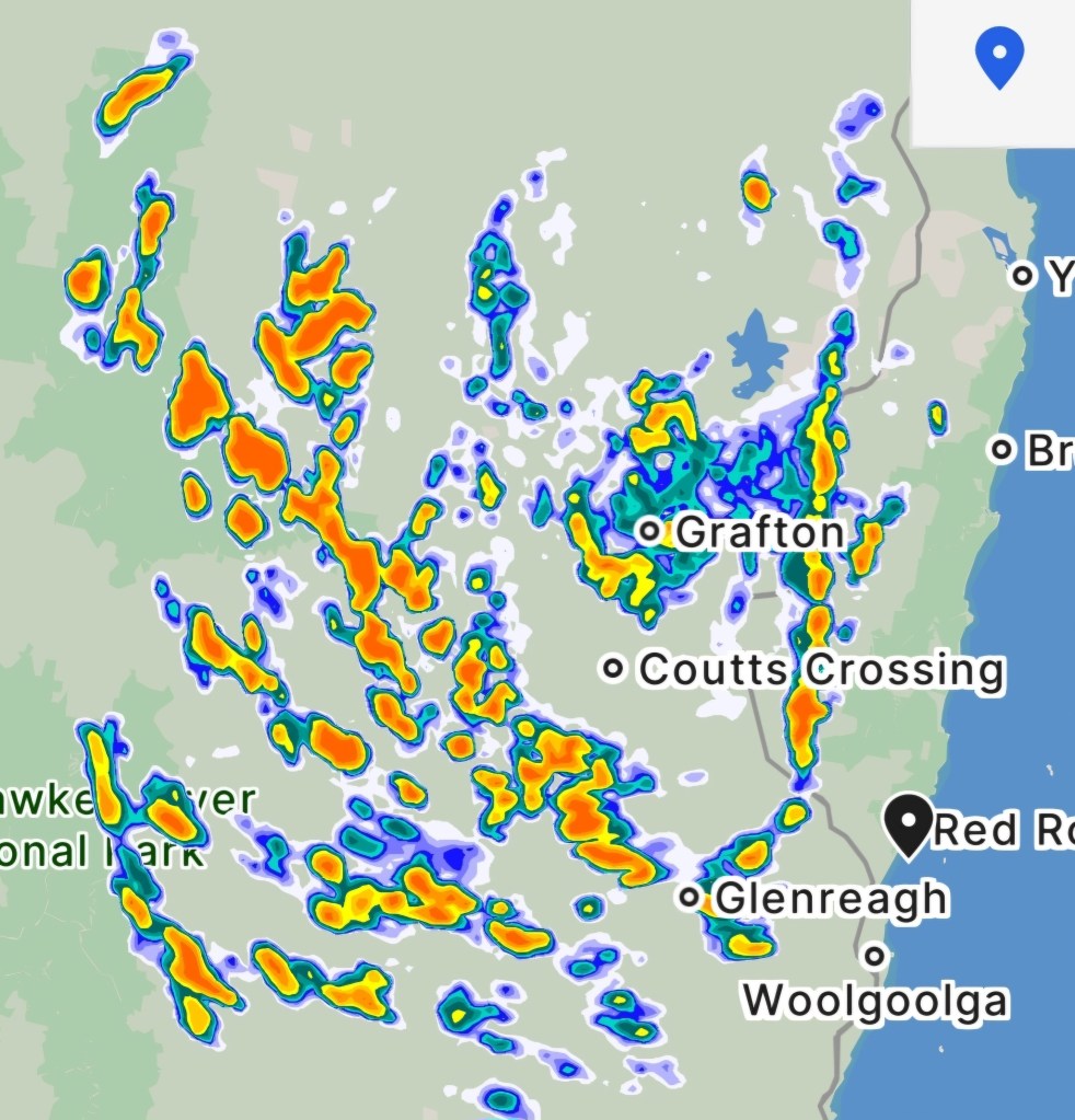 The caravan park is on the southern side of Corindi Creek, and there is no other facility here apart from a kiosk. We plan to have a couple of quiet days, catching up with caravan maintenance. Once we were set up, I put out the awning and watched lots of water flow off. This must have accumulated over the days of heavy rain while the van was in storage.