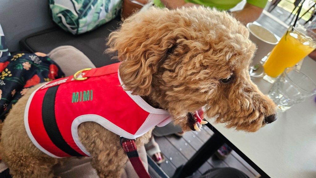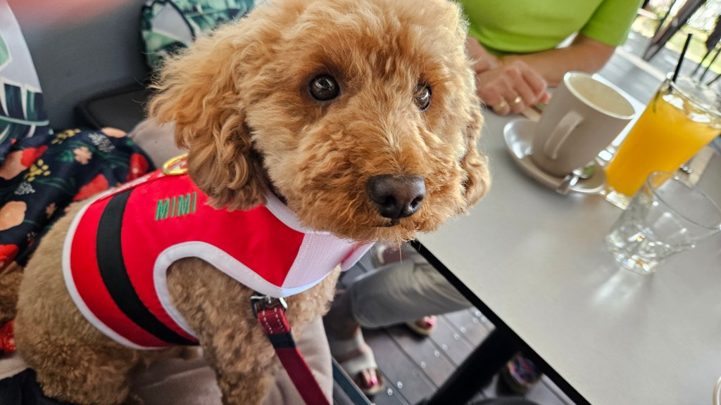 While Anita was out seeing a movie, I took Bluey to the park with our other visitor. He greeted his friends but was happy to walk with us to Ramon Bro and wait while we had dinner. A spoodle arrived with the family sitting at the next table, so there was a friendly dog meeting.