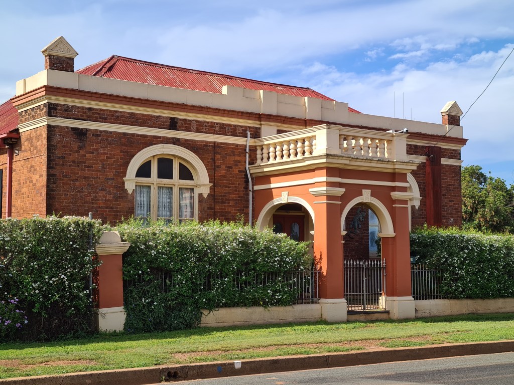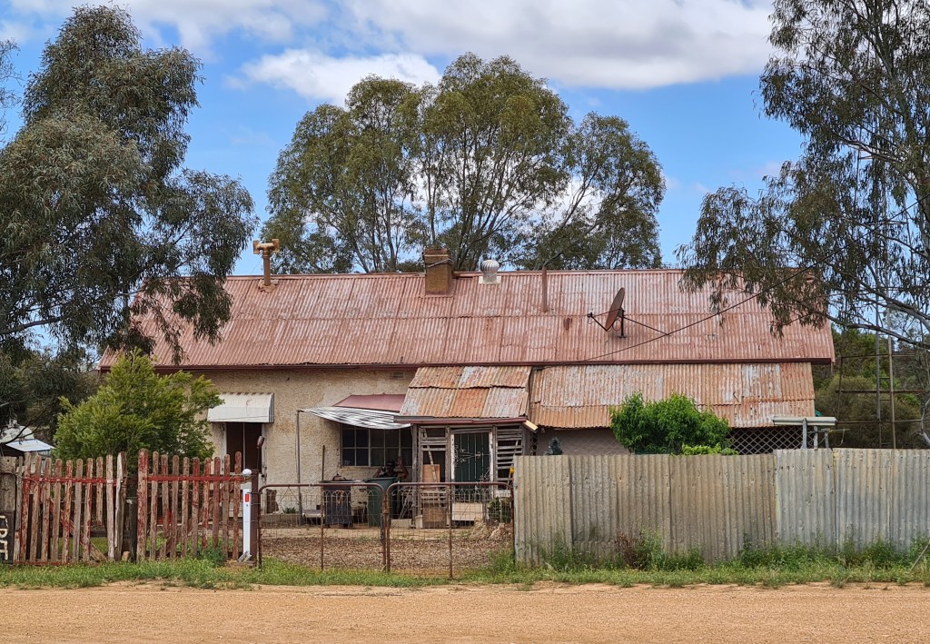 We had decided to stay in a free camp behind the RSL. Entry to that area was a bit muddy so we moved to the sealed carpark the other side of the fence. We took Bluey for a walk around town. My favourite building is this private house with its original roof.