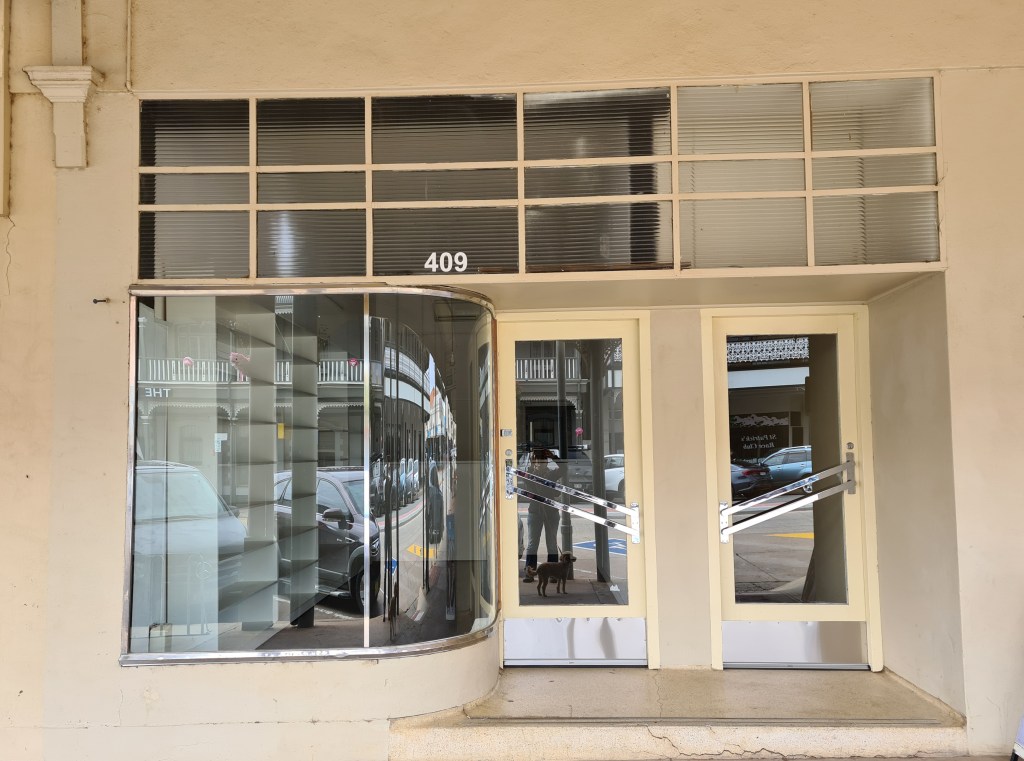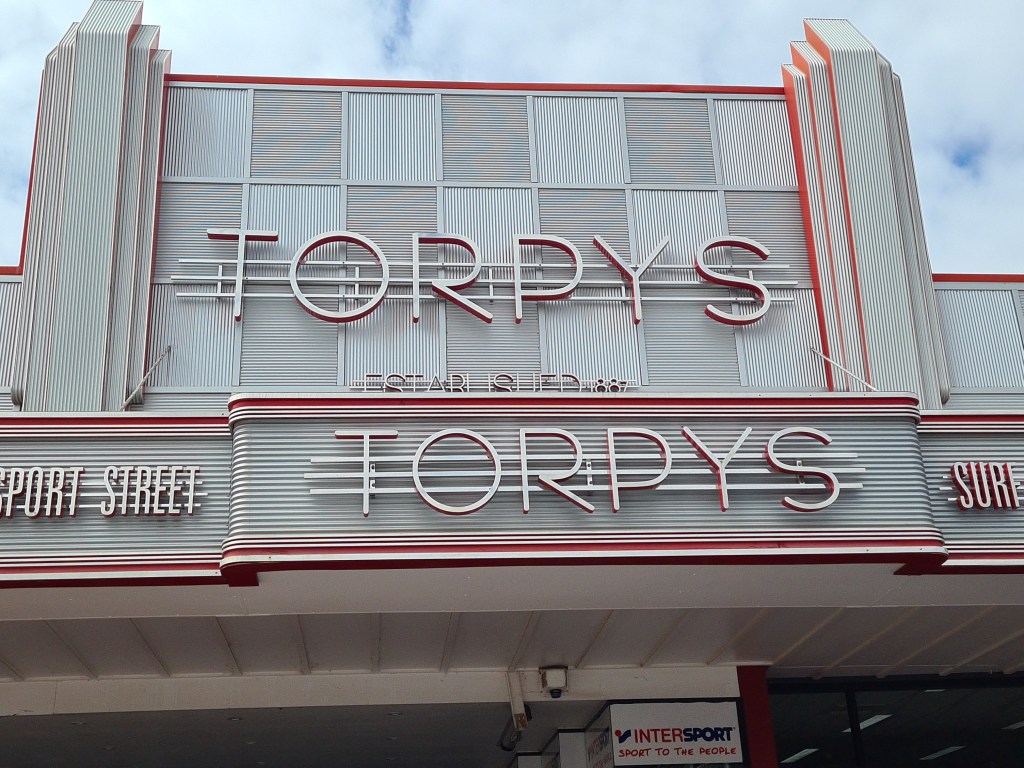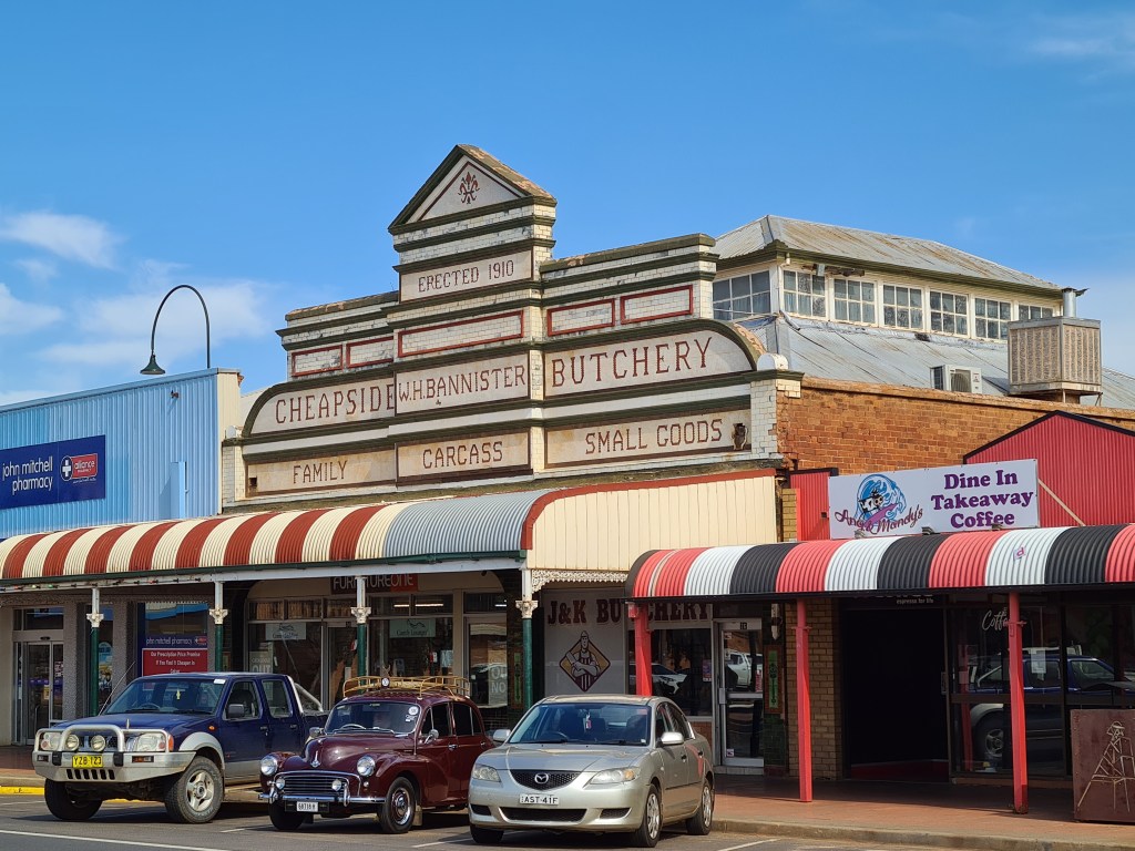 We had breakfast at The Silly Goat, one of our favourite cafes. Unfortunately Anita’s eggs were not very good, but the coffees were great. Outdoor seating is basic so we shared a large table with a baby, mum and grandma. We had parked in front of this Art Deco shop with its interesting pattern of alternating horizontal and vertical corrugated iron panels. A nearby shop has several curved glass windows and chrome handles from the same era.