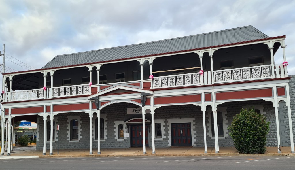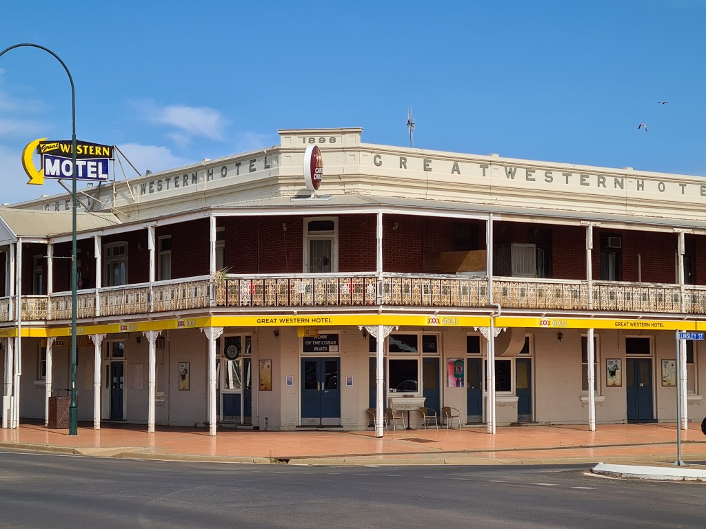 Unfortunately most of the historic buildings have not been well preserved. The 1898 Great Western Hotel is spoiled by the midline yellow band advertising a certain beer, and the 1960s Great Western Motel sign. The cast iron veranda panels need attention.