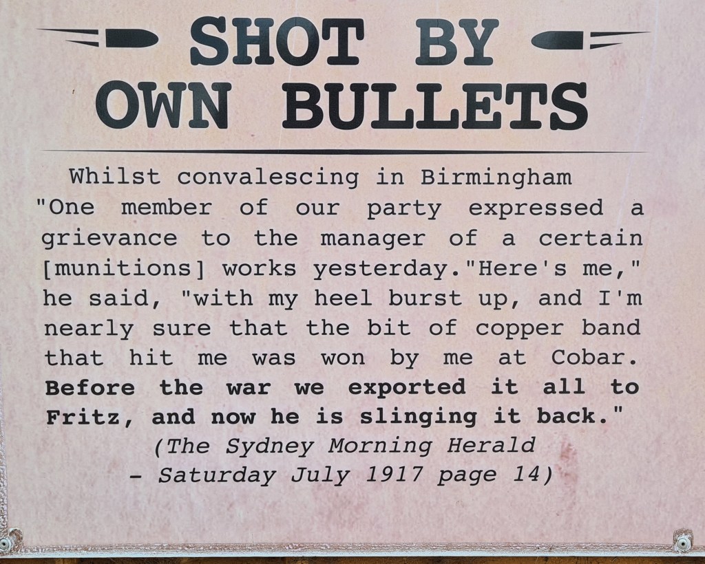 On the outside wall of the RSL there are commemorative plaques and posters. This 1917 article from the SMH is salutory as we are sending iron ore and high grade coal to China which can be used to manufacture military weapons.