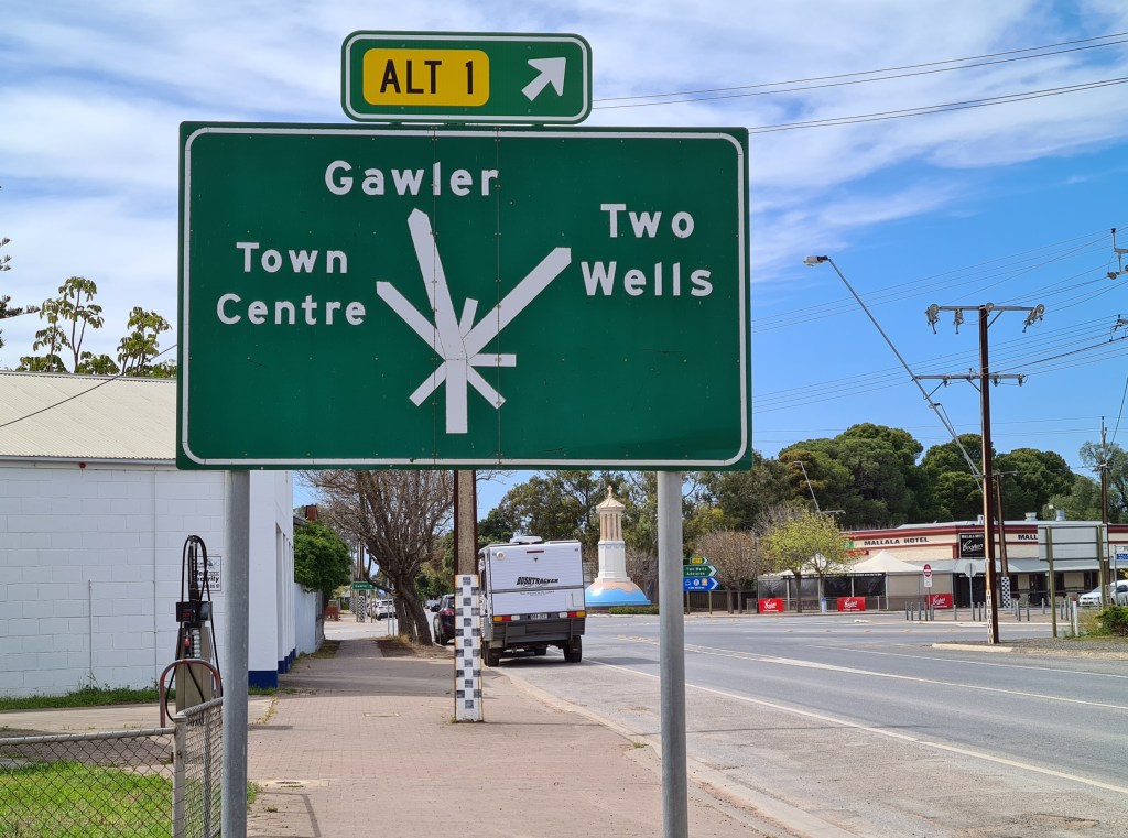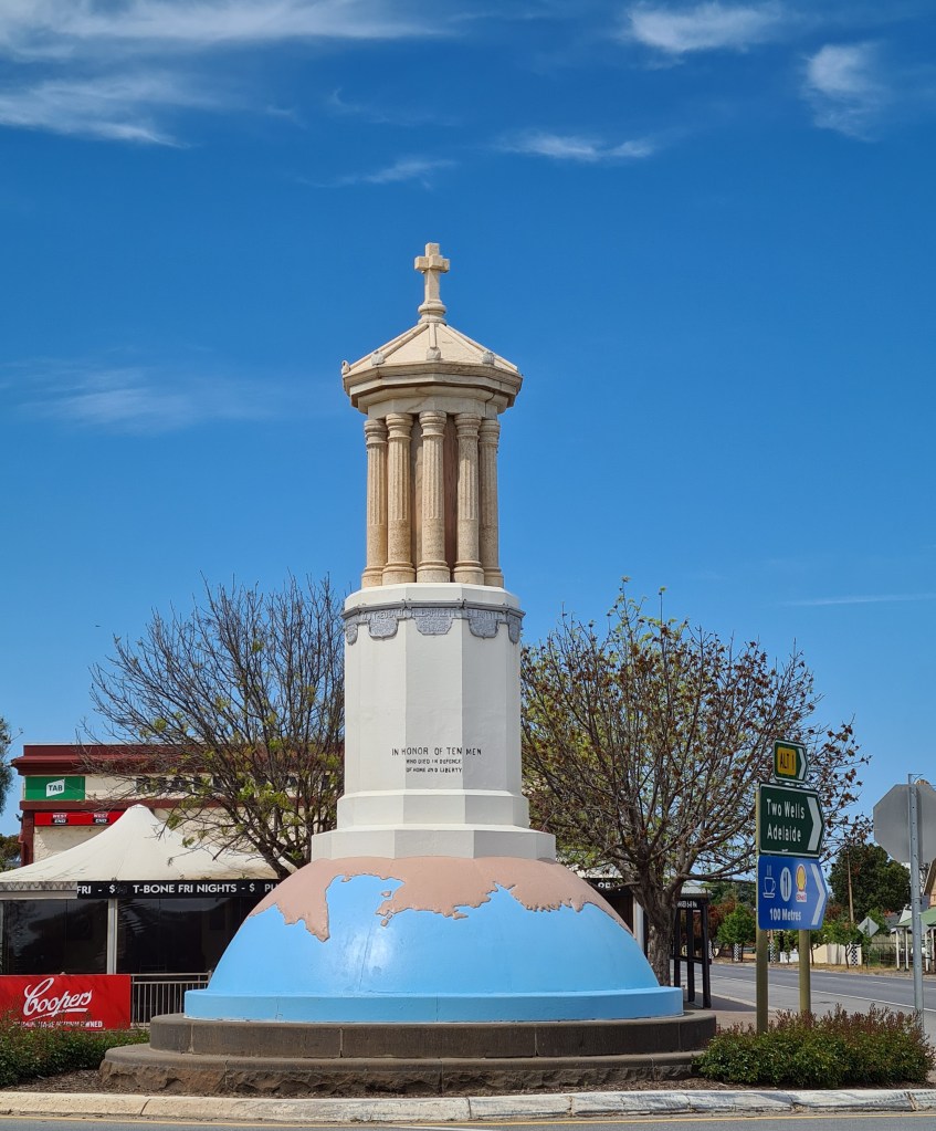 Our only stop was at Mallala where there is an eight ways intersection. There is a very unusual war memorial in front of the Mallala Hotel. Mallala has a motor sport track for racing a variety of vehicles, which is why the Stobie pole near the Bushtracker is painted with black and white checks symbolising the winner’s flag.