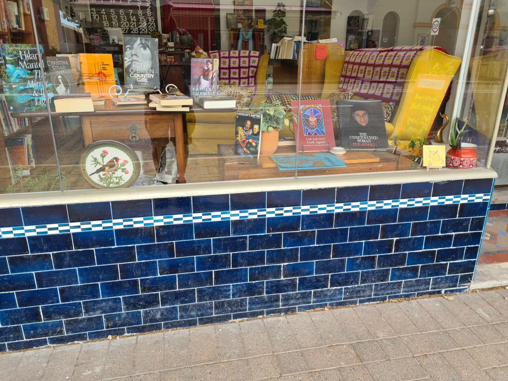 The Goodwood Bookshop is in an old shop with its original tile frontage and window framing. The interior decorations are attractive.