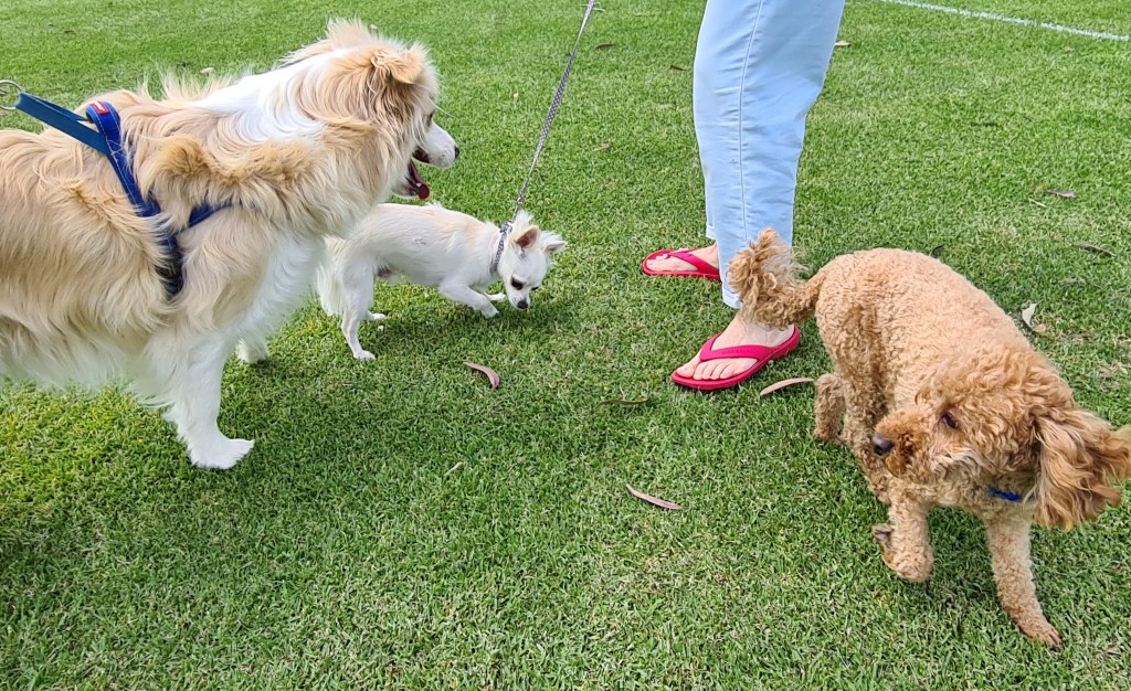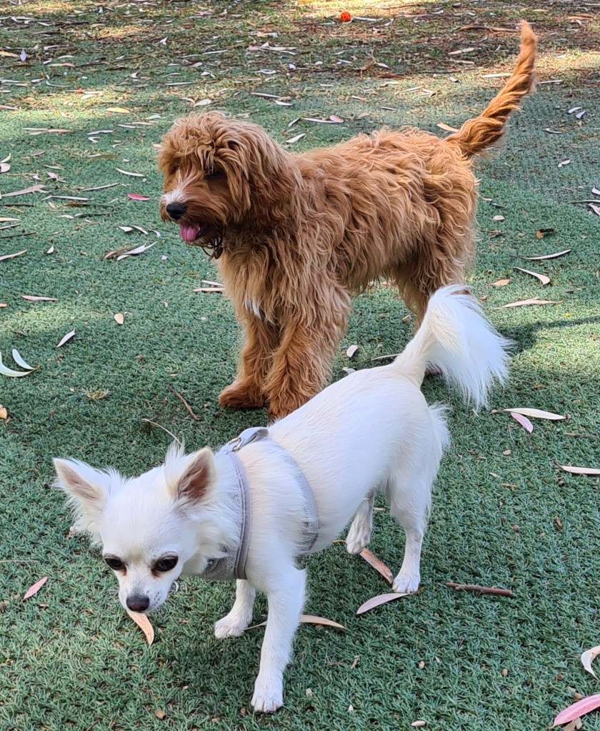 As the rain had gone I suggested a trip to the Small Dog Park with Bluey and little Leo. This is a great park for dogs under 15kgs. The fence is high, solid and well secured into the ground so there is no risk little dogs could escape. The adjacent park is for All Dogs so there is no reason big dogs should be in the small dog park. When we first arrived there was a 6 month old puppy to play with, and a 3 year old on epilepsy medication.