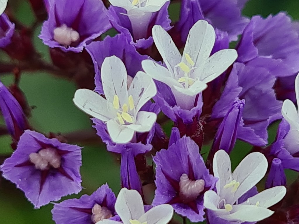 The plants in the skip bins have started blooming with white flowers out of the purple flowers.