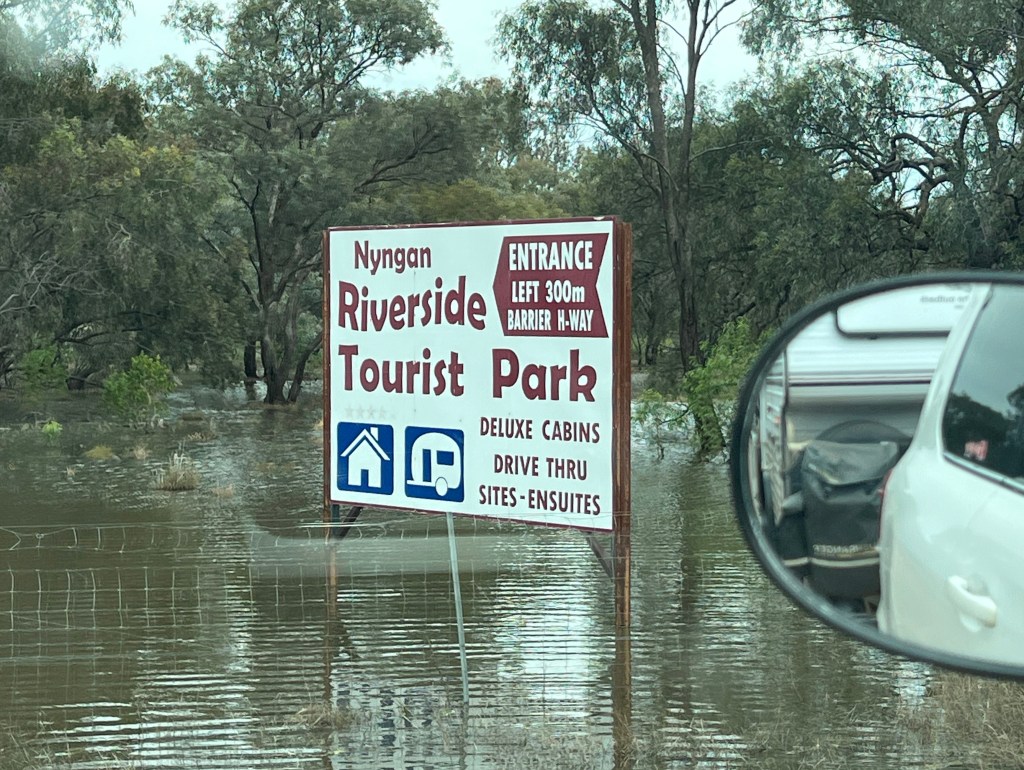 We turned onto the Barrier Hwy and chuckled at this sign for the Riverside Tourist Park. Photos on FB show large areas of the park covered by water. We have stayed at that park a couple of times when in drought.