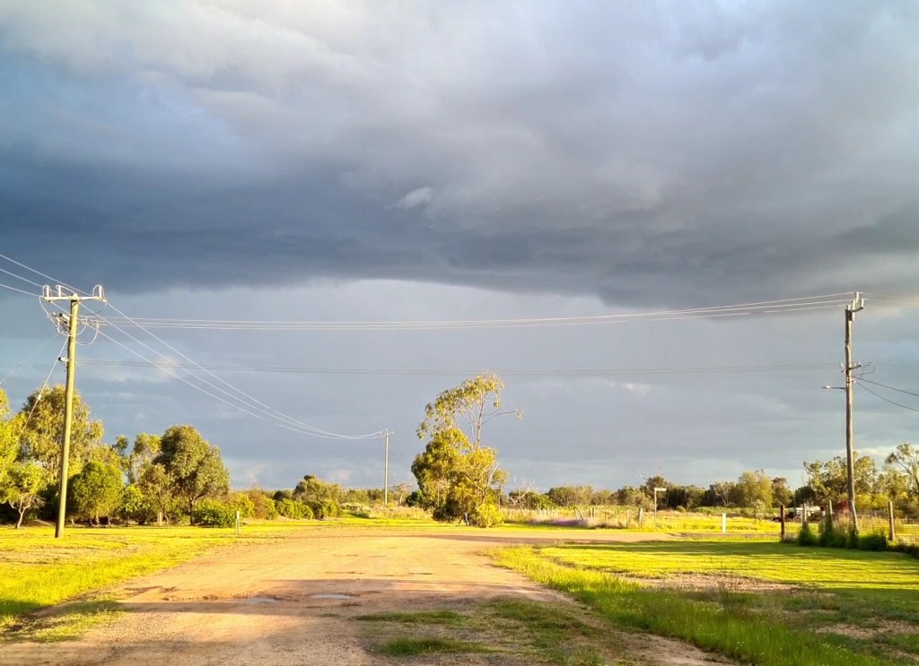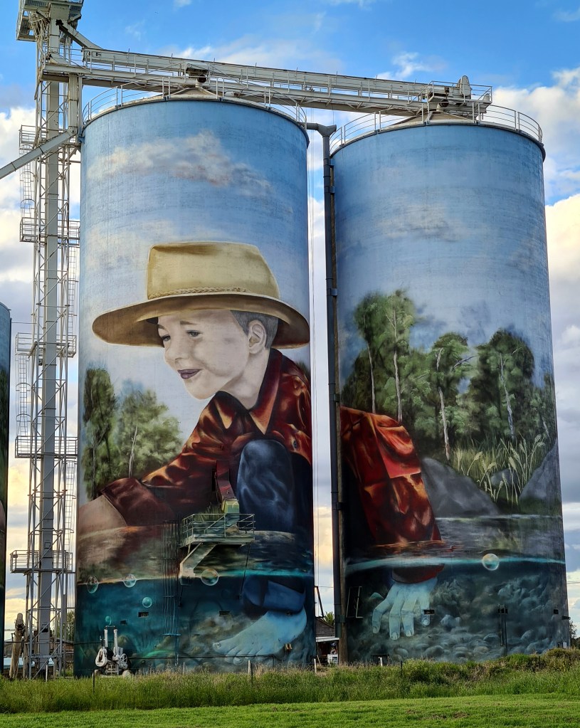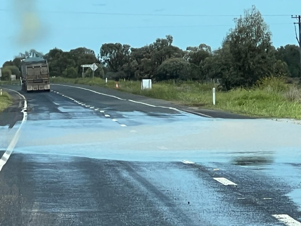 After a stop at the dump site we crossed the Macintyre River into NSW via Gunsynd Way. We joined the Newell Hwy for the 125kms trip to Moree. The northern section of the highway was in excellent condition, but further south there were several sections with lots of potholes. The highway is wide with a decent shoulder so we could avoid the worst of the rough patches by driving with our left wheels on the shoulder, or sometimes with our right wheels just on or over the centre line when safe to do so. In a couple of places there was water over the road, or water both sides of the road.
