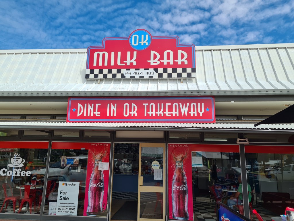 We left Yelarbon just after 9am. There was nowhere to buy a coffee so I had to wait until we got to Goondiwindi. Anita went to Visitor Information to check road conditions, while I took Bluey to the Milk Bar for coffee. When I was a kid the only drinks available at our local milk bar were milkshakes and spiders.