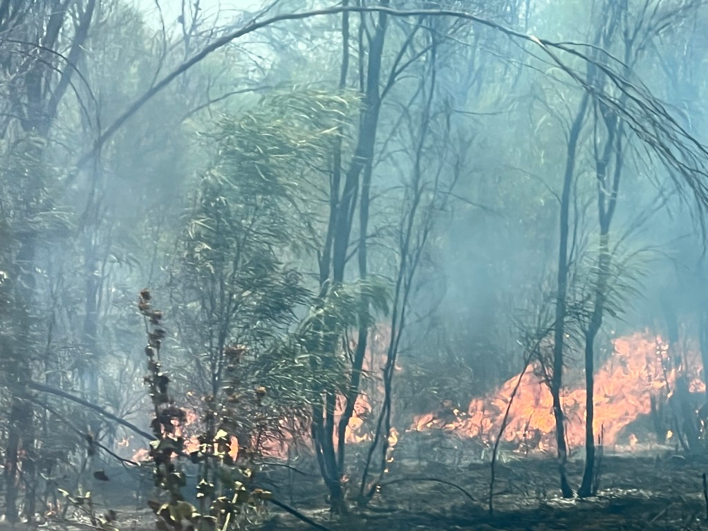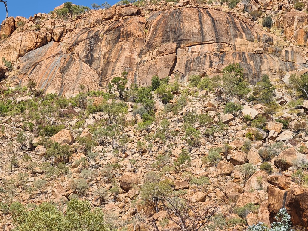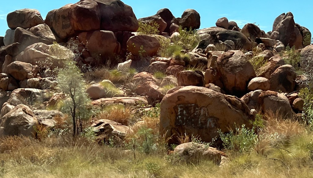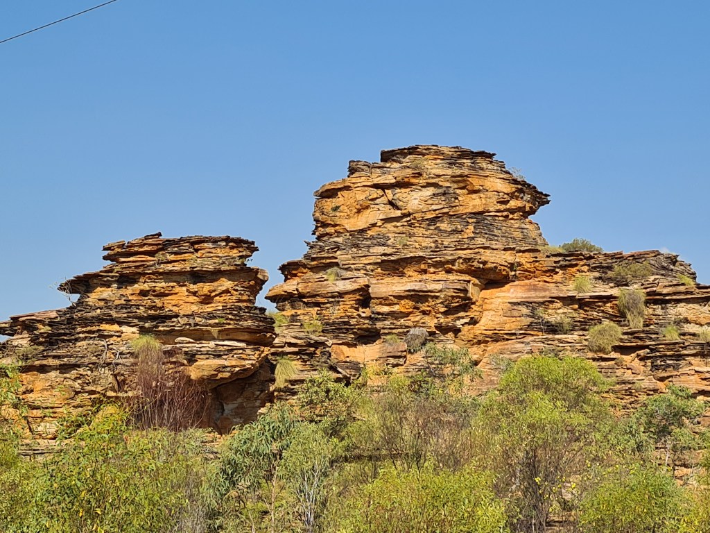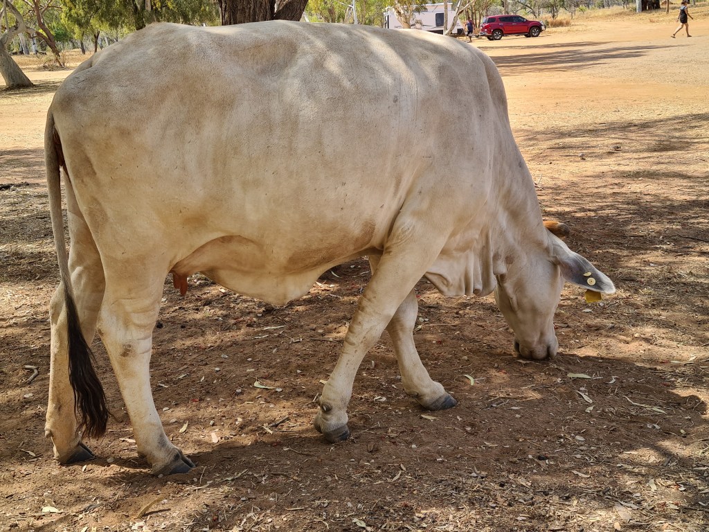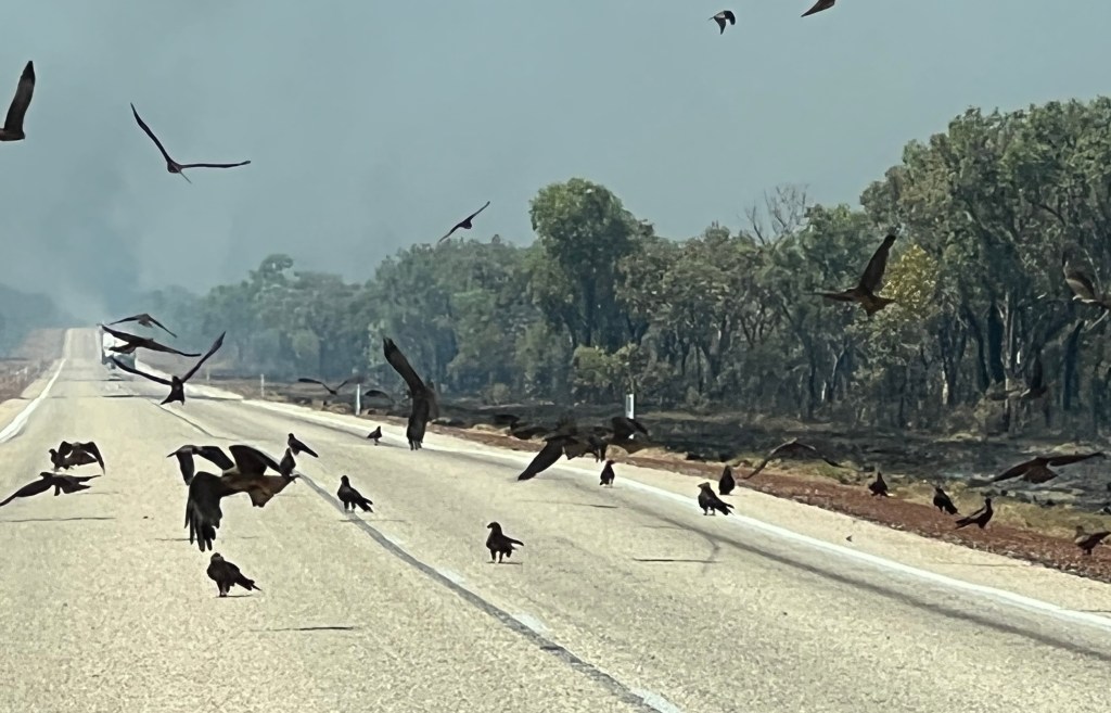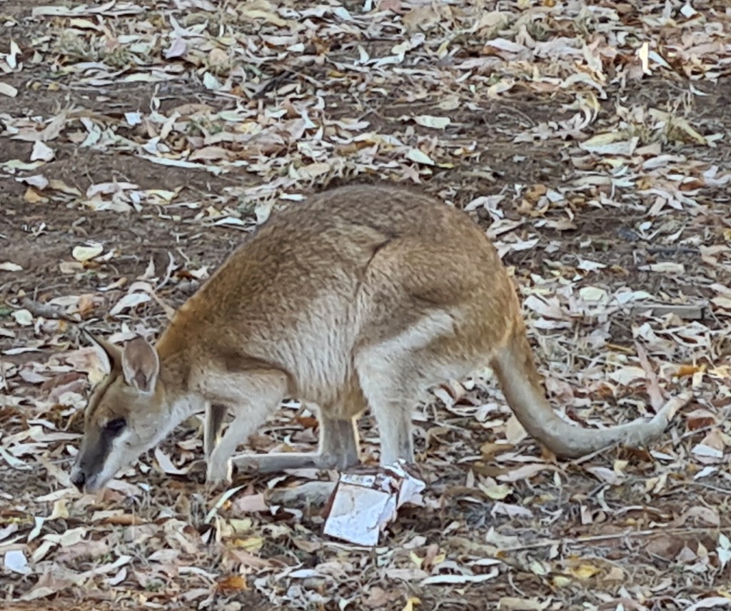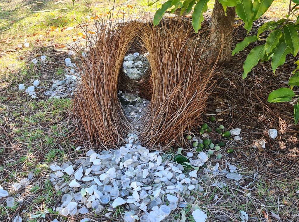 There is a Great Bower Bird nest under a bush near the amenities, with a collection of rocks, bottle tops, pieces of glass, and bits of blue peg. The walls of his nest are made from hundreds of twigs erected like an archway. Other campers told me other male birds tried to take over the nest. The builder of the nest destroyed his structure to chase away the invaders, and has since completed the rebuild.