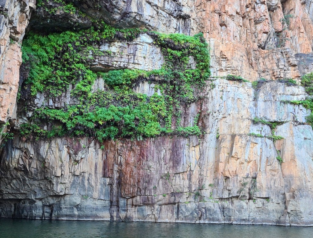 On the return journey the gorge walls were bathed in sunlight. We saw swallows building their mud nests on the roof of a cave, a darter bird, and a freshwater crocodile sunbathing. Any saltwater crocs spotted in the gorges are trapped and relocated to a more suitable habitat, because their nests get swept away in the wet.