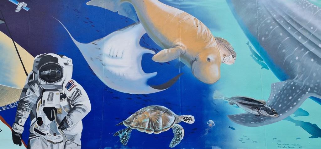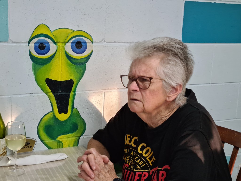 We had dinner at a basic Thai restaurant, located among houses in a suburban street. The reviews were good, but the food a let down. There are very few tables and orders after 7pm are takeaway only. The mural has Chris in the shark’s mouth, and Neen communing with a green bug-eyed creature.