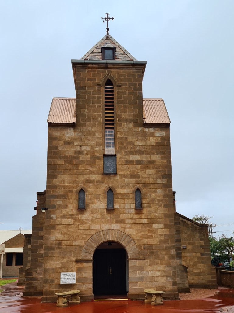 The wind eased but there was light rain on and off all day. We had breakfast out but both the food and coffees were pretty ordinary. While Anita was in the shops I wandered around town taking photos. Some historic buildings have been retained in the town centre. The 1935 Church of St Mary Star of the Sea is an unusual sandstone structure.