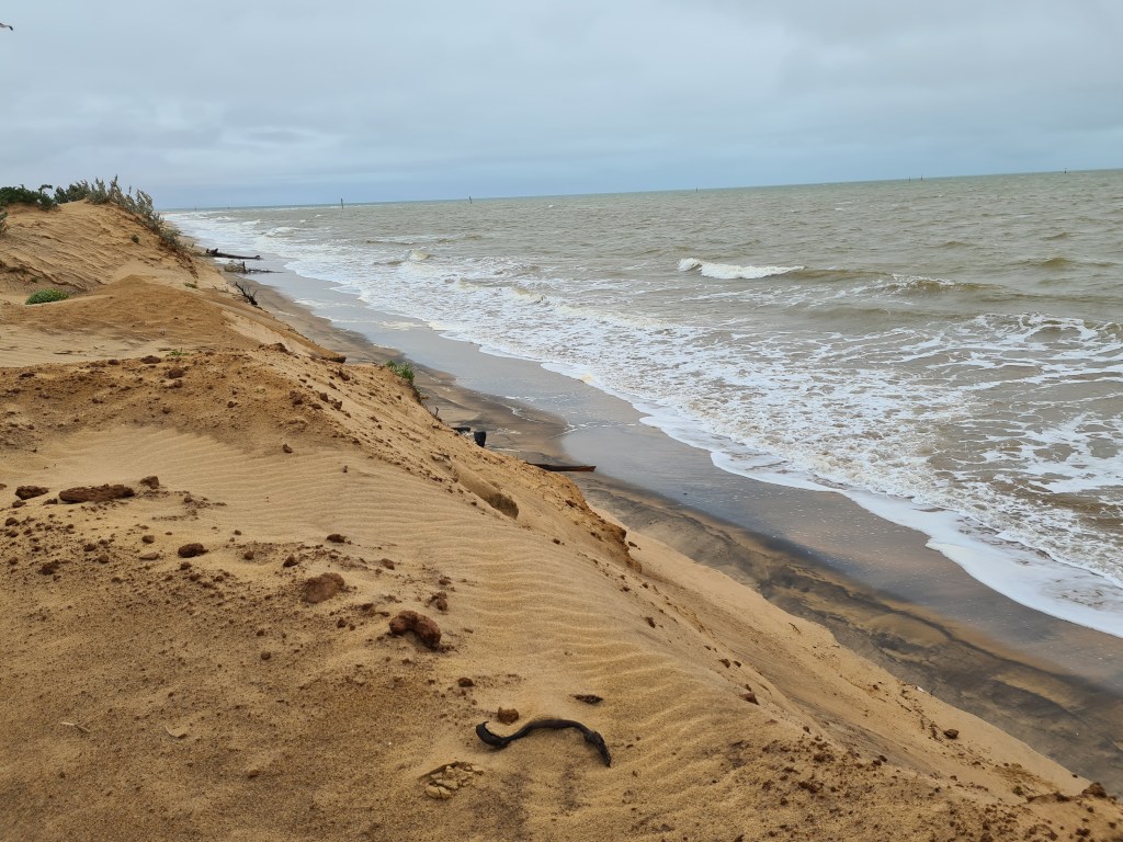 One section of road on the island can be covered by drifting sand. The rough seas were eroding the beach on the other side of the dunes leaving a cliff about 3m high.