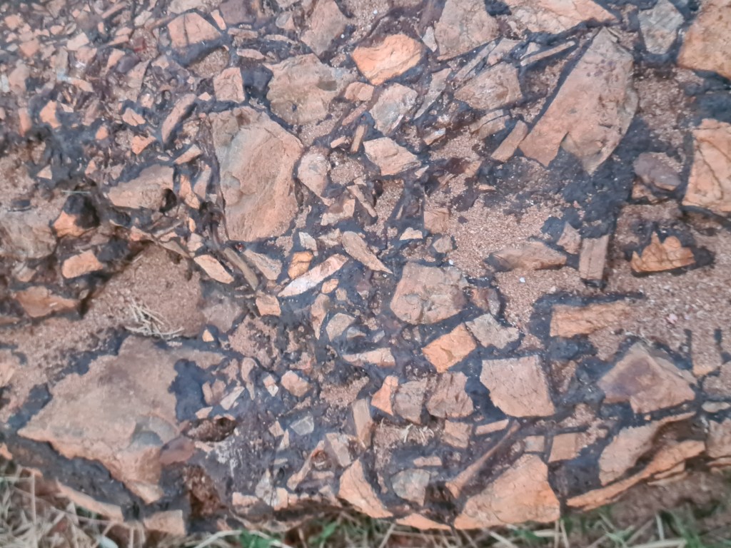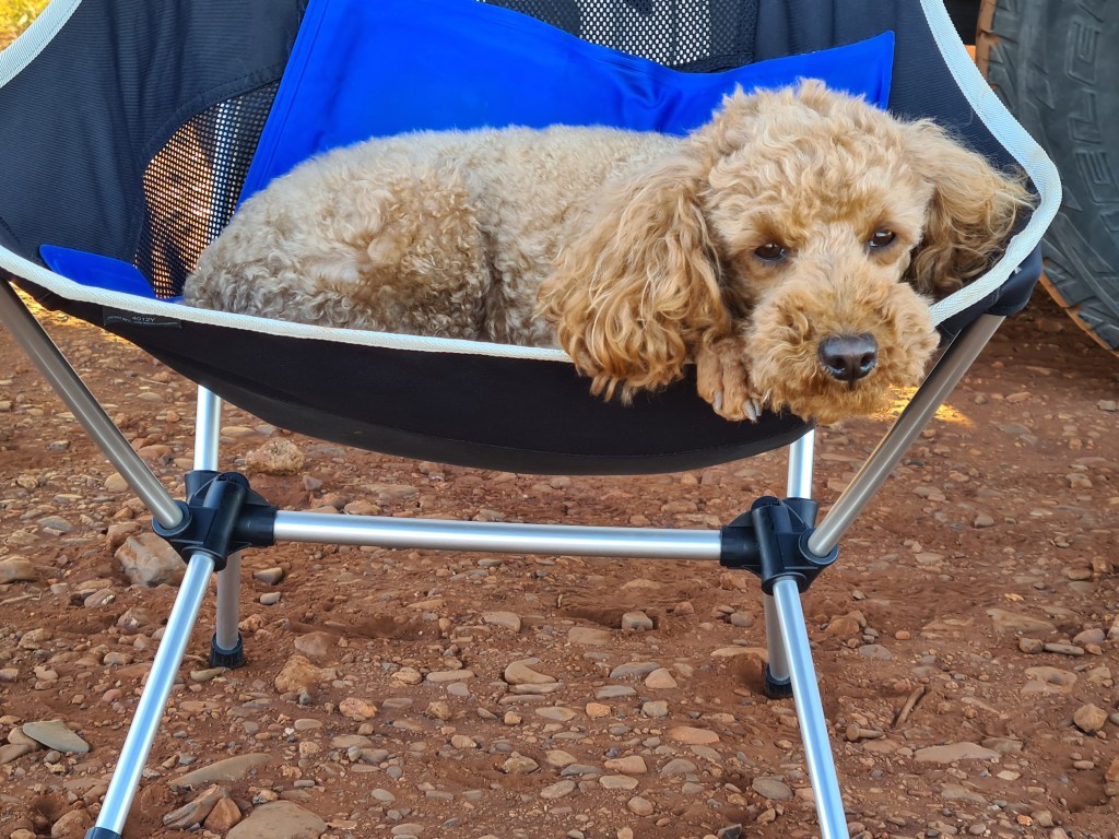 We are surrounded by red dirt. It took over 10 minutes to clean Tilly after a short walk. Bluey has been carried around because he absorbs the dirt! It was too hot for him in the van so I let him have my chair with a cooling mat.