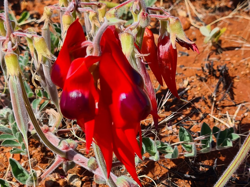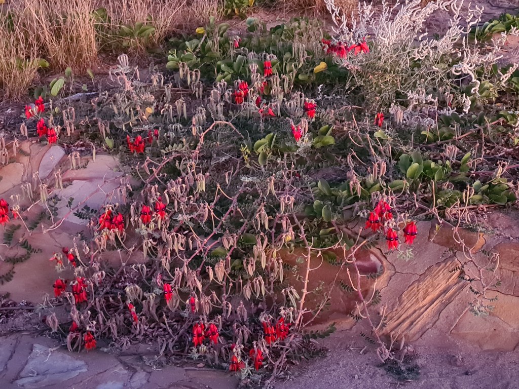 There is a patch of Sturt desert pea near the lookout. It is smaller than it should be as our neighbour-who-can’t-reverse picked some of the flowers and has them on display outside his van. He could be fined up to $2,000 for this selfish act.