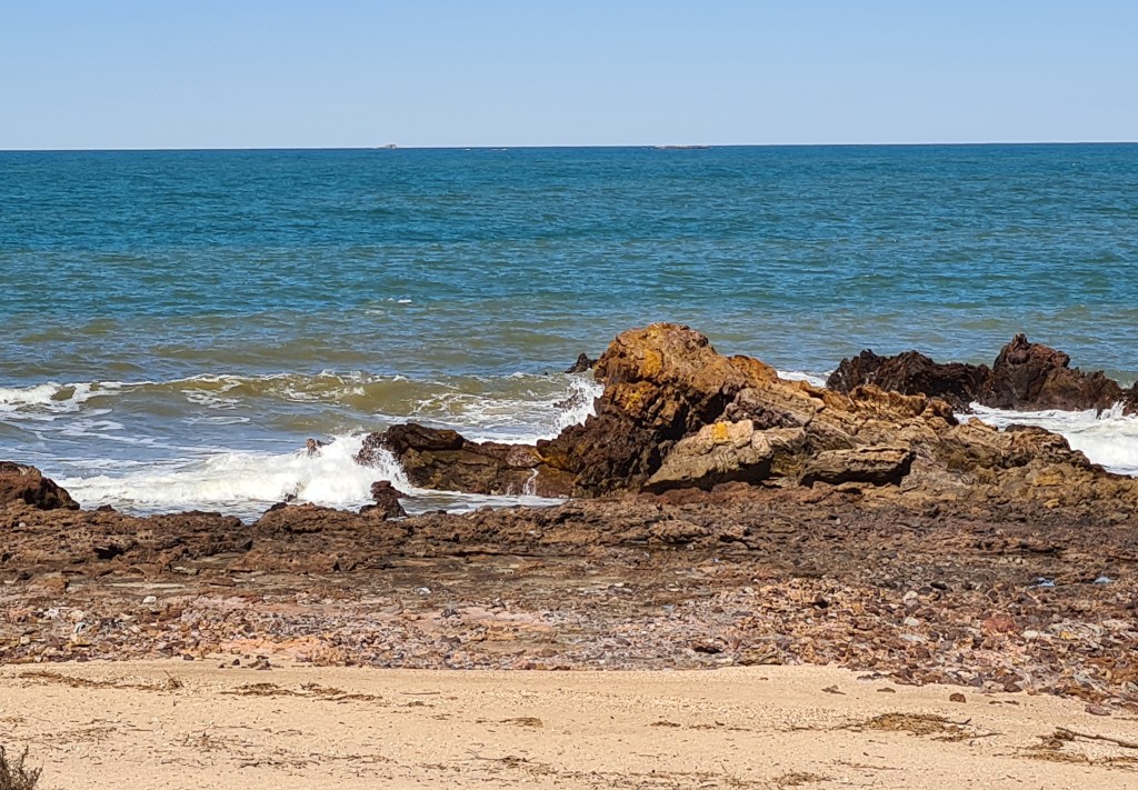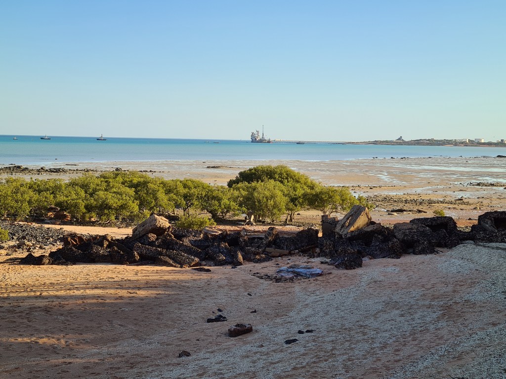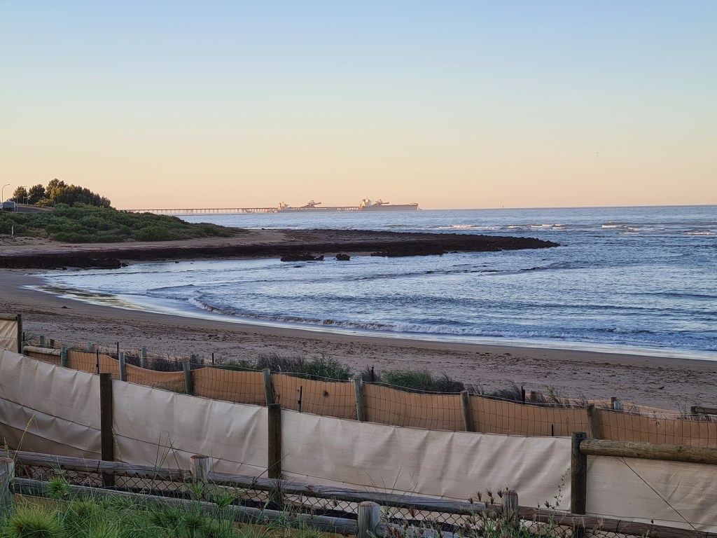 Near our park there is a narrow section of sand behind the rocks in the ocean. On the other side of the lookout there is a beach protected by a rocky reef. Dogs are not allowed on that beach because birds nest in the dunes. In the distance we can see the ship loading facility at Dampier.