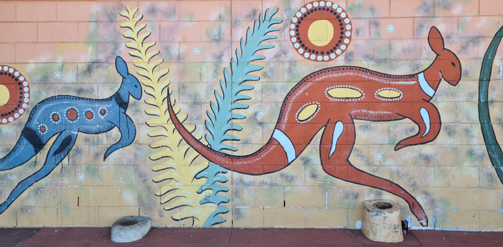 Wickham was established in 1970 for mine workers, with a shopping centre, extensive sports fields, and other community facilities. There is also a large Aboriginal population in the town. This mural is one of several around the shopping centre. Unfortunately there is also extensive physical security around external equipment, doors and windows