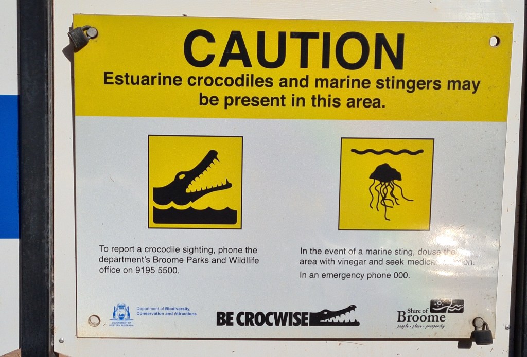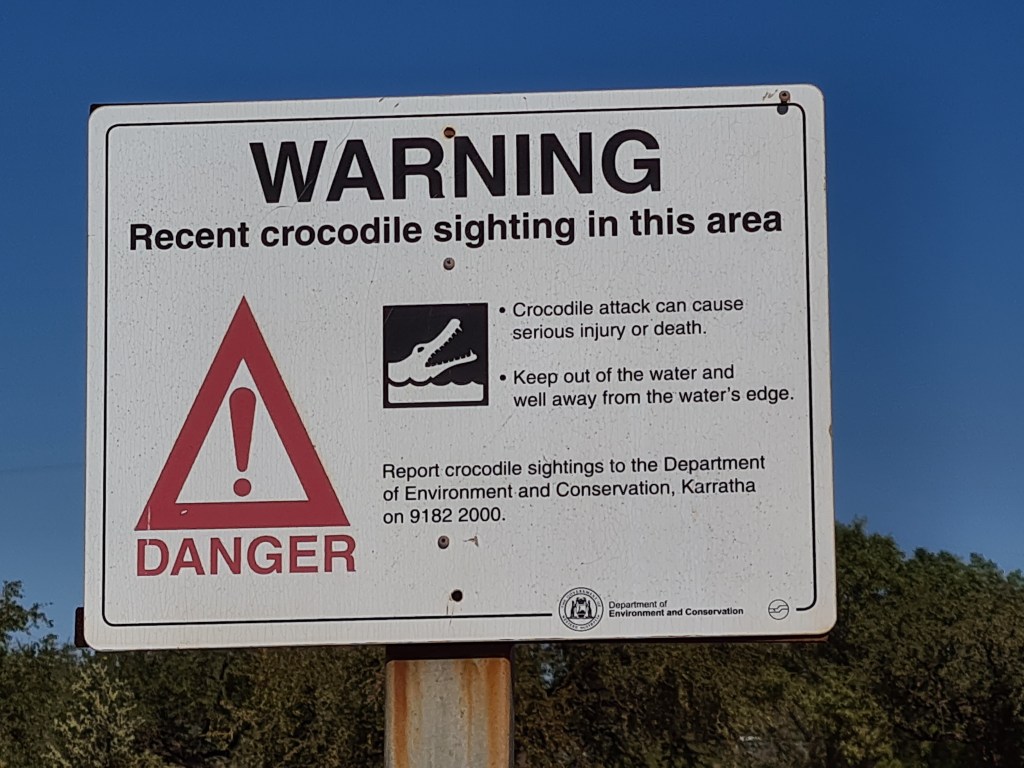 We had booked into Pardoo Station for the night and knew we would be driving on a dry dusty gravel road for about 10kms. To reduce the amount of dust getting into our van we stopped at a roadside rest area to close the lower waterproofing door. These signs were a salutary reminder of hazards in these remote northern regions.