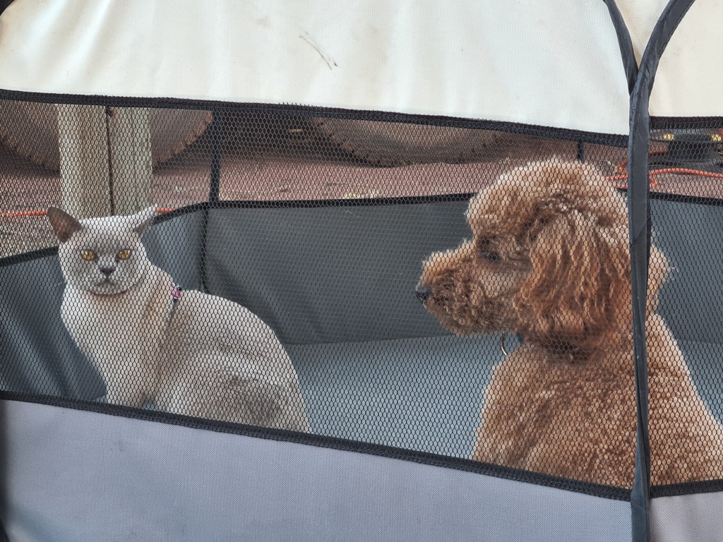 We had a short stop for me to take Bluey for a walk. It was 30°+ and he showed no interest in doing a pee. I put him back into the crate and discovered Tilly was missing! I yelled for Anita to help find her and she quickly grabbed Tilly from under the caravan! I had pulled the zippers together on the critters’ crate without realising one side was not closing. That is now another thing to double check every time we zip up the crate.