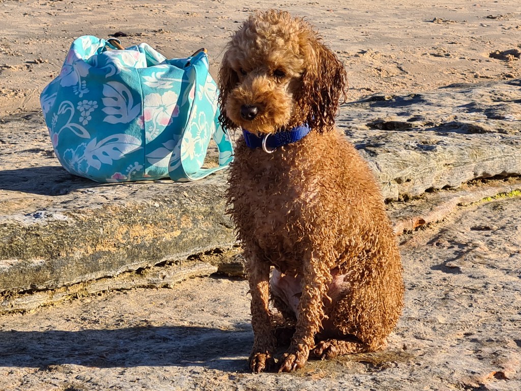 I walked Bluey along the beach with interesting rock pools and striking cliffs. The colours are dramatic. I chatted with two women sitting in a rock pool with a much older dog.