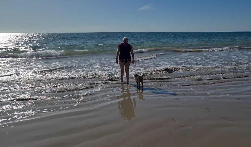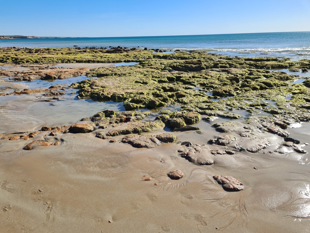 Anita didn’t want to swim so I took Bluey for a run on the beach chasing his ball. The tide was out so he could run on the wet sand without rolling in the dry sand. We walked south where the beach was different from the cliffs and rockpools to the north. There was a coating of seagrass on the recently exposed rocks.