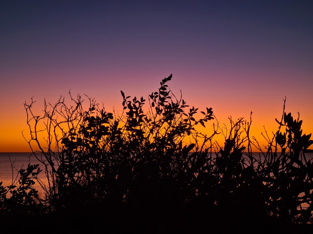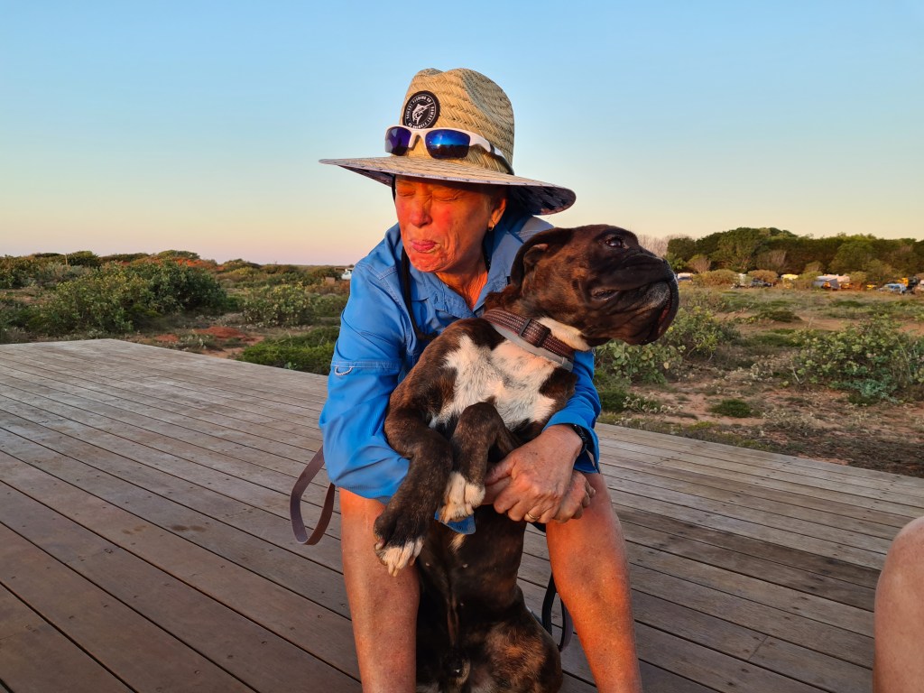 We met up with our friends for sunset drinks on a deck at the top of the cliff. When Anita took a beer from the fridge Bluey thought she was going to the motorhome. We couldn’t take hime with us to the deck as it is surrounded by grass and undergrowth, an area that might have brown dog ticks.
