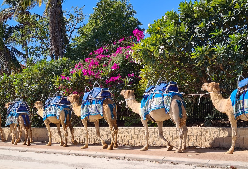 Cable Beach was not crowded and we easily found a car park. The camels passed us heading towards the beach.