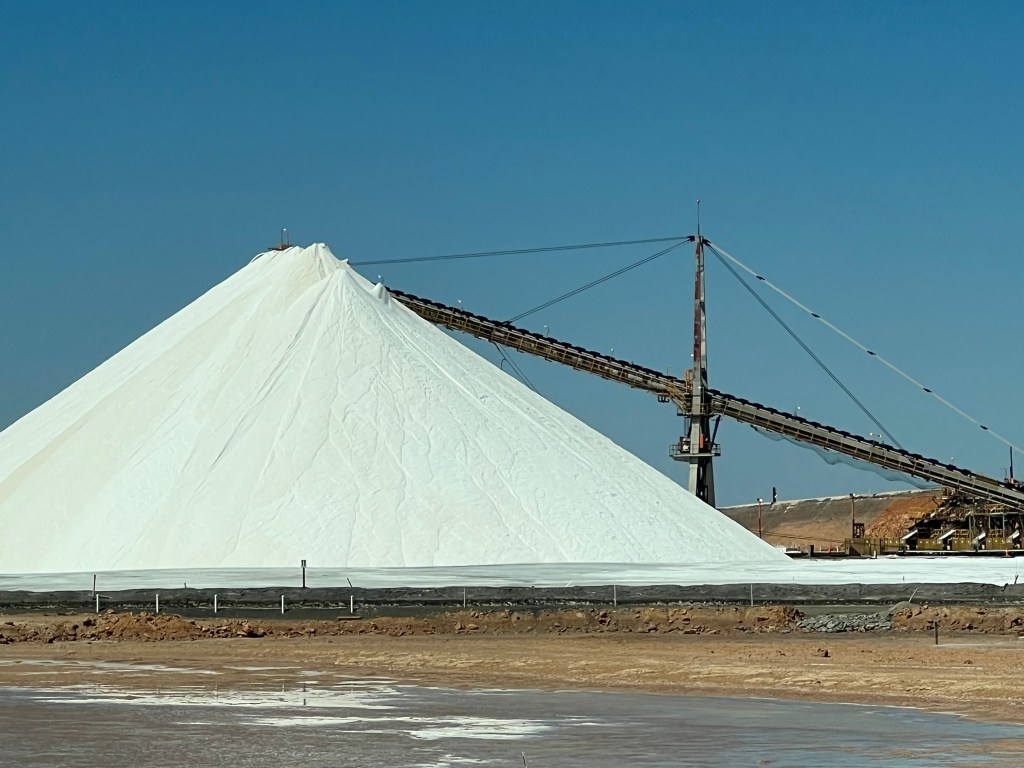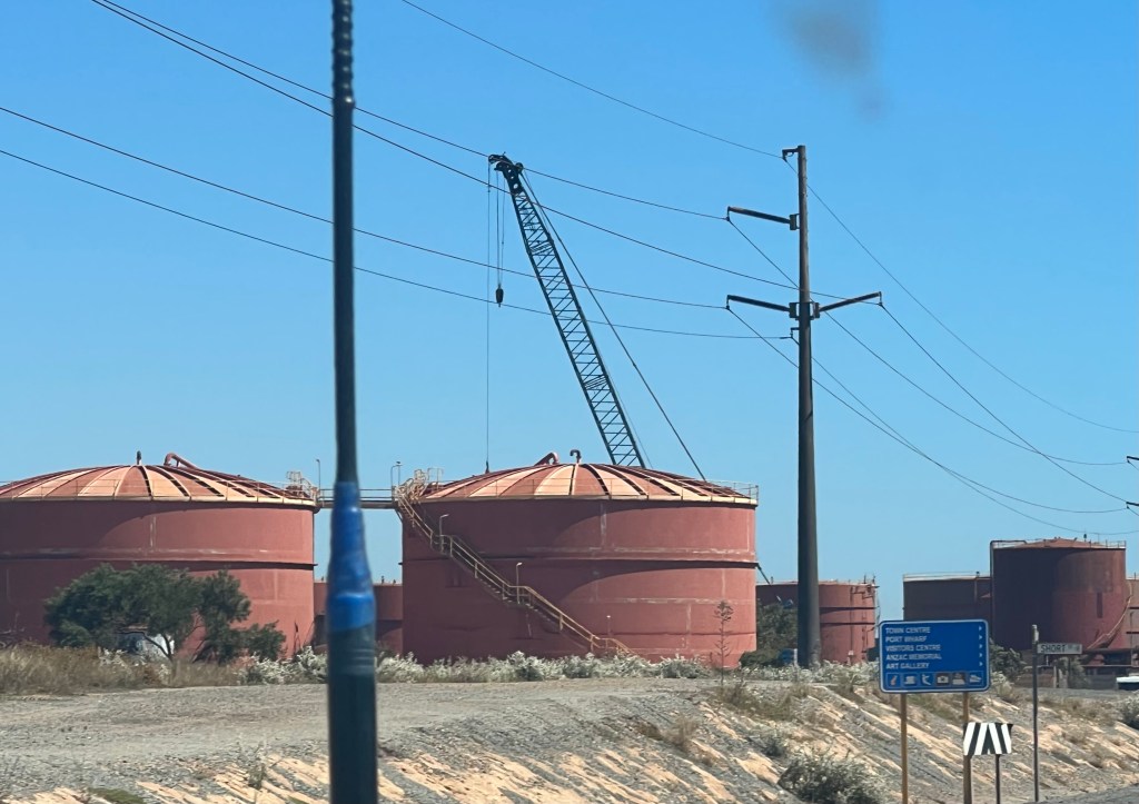 The highway initially goes in an ESE direction, and we were driving into the headwind, causing our fuel consumption to jump up to 30L/100kms. The road changed to a NE direction towards Port Hedland. There is a bypass road but I thought we should at least do a drive through to find cheaper fuel. The salt mine is next to the highway. Closer to the port these tanks are typical of the industrial town.