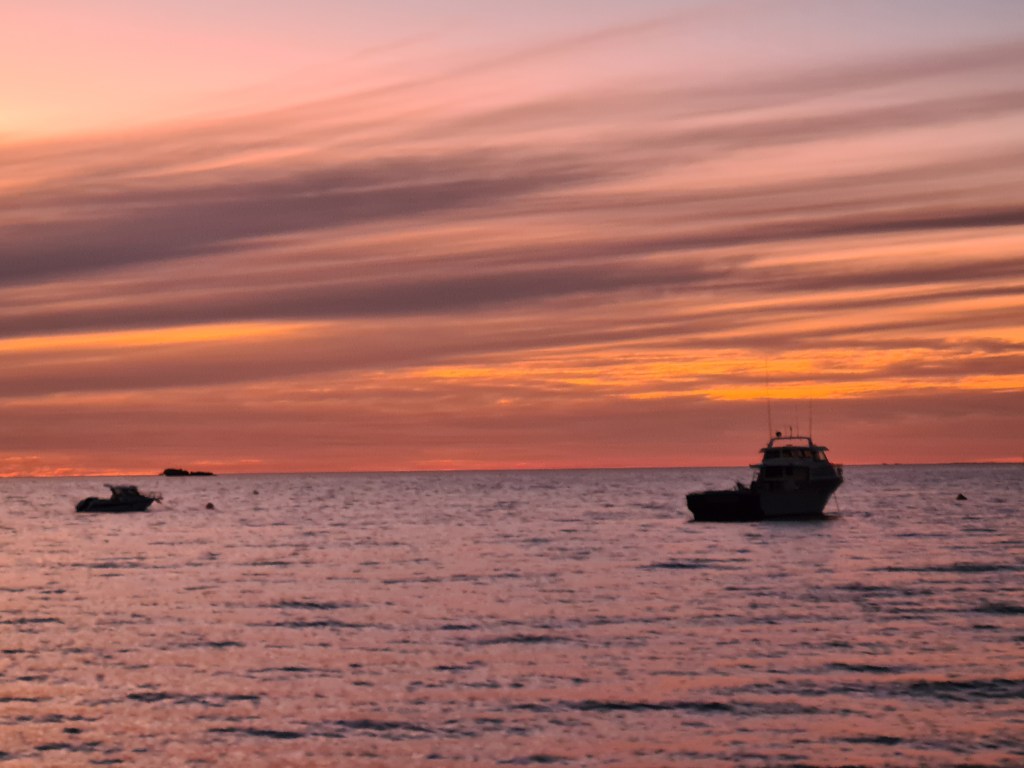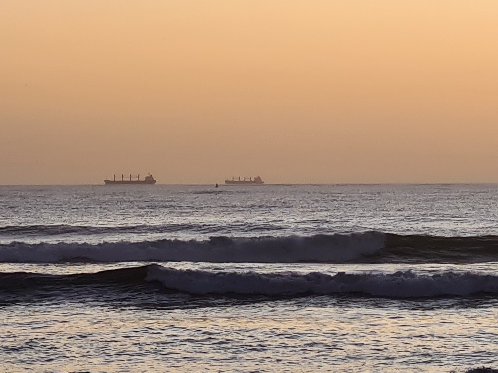 Bluey had a fun run on the beach with this lovely girl. She crouched in the sand inviting the game. Several ships are waiting to enter the port. Two are in front of our caravan park. The sunset became more intense over the next half hour.