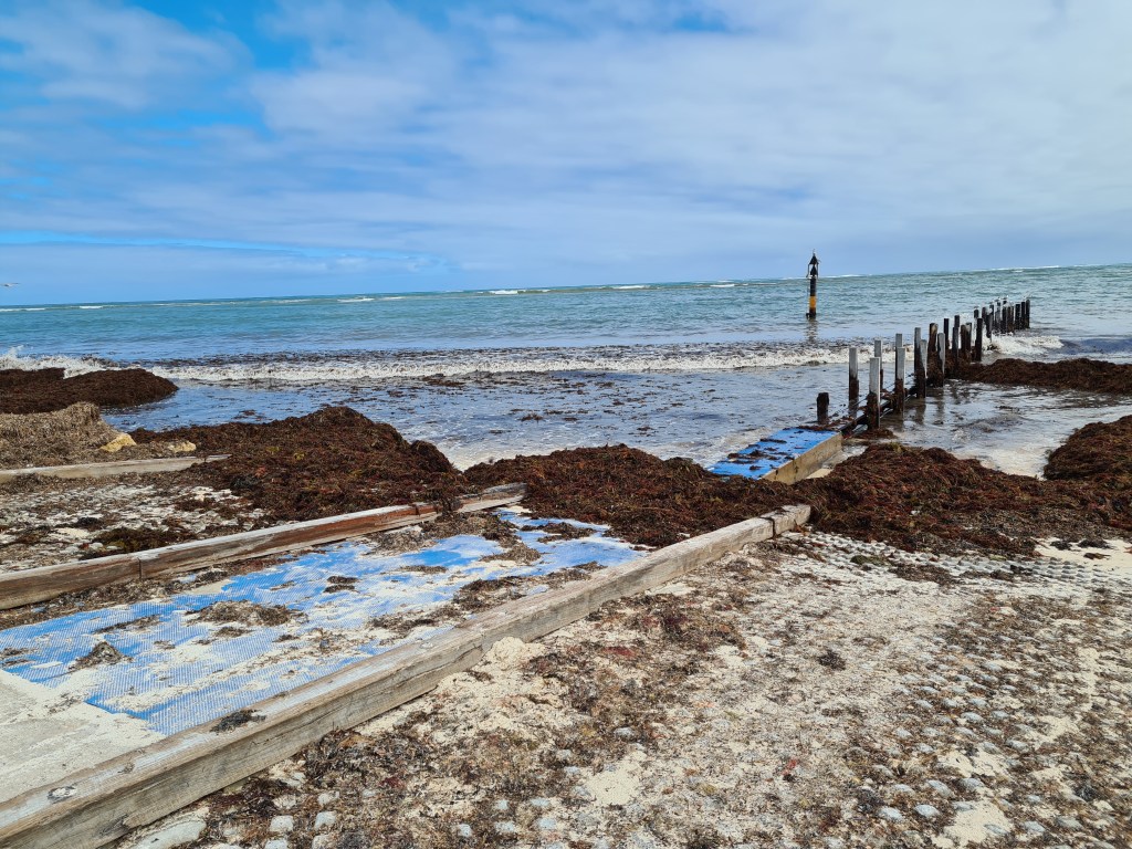 We stopped to have coffee with our Jurien Bay friends, before heading north. We drove through Dongara where the boat ramp was unusable because of seagrass washed up due to the large swell. There is a free camp in Dongara, but it was too wet and unattractive. Bluey blended in with the colour of the sand.