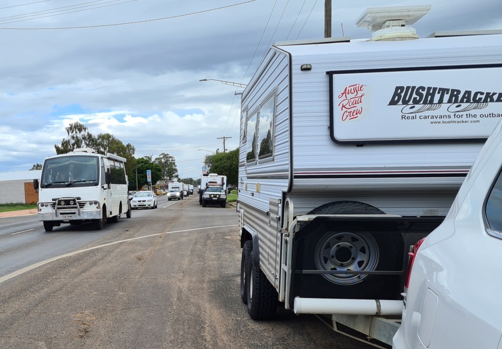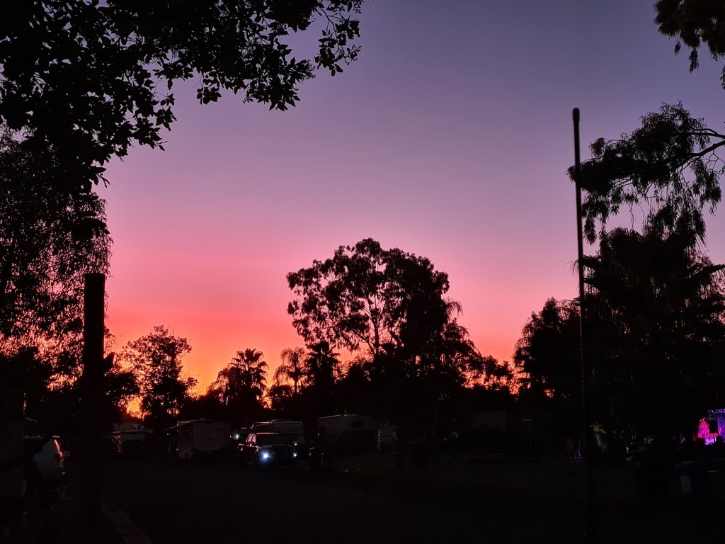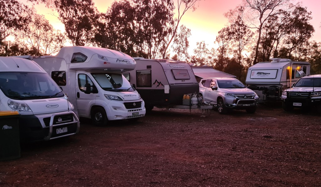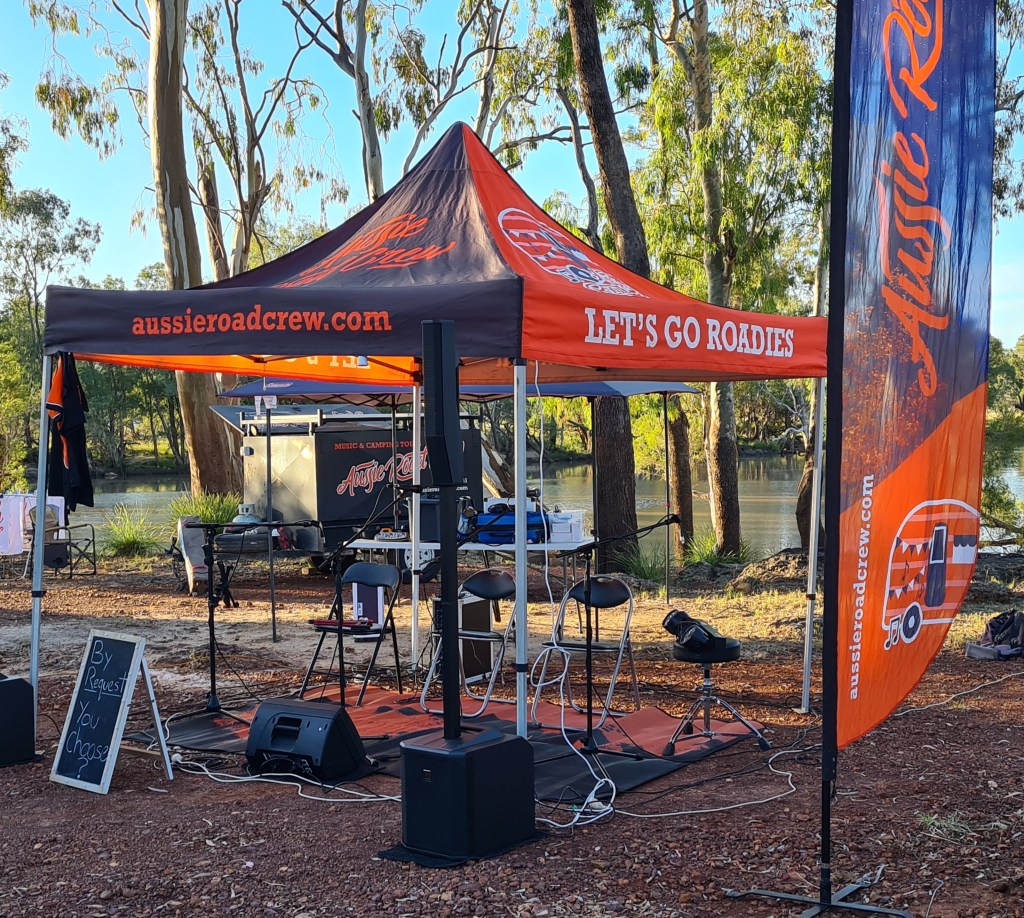 Back at the caravan park preparations were underway for Rosemary’s Champagne Day. I avoid these events and stayed in our van doing a sewing job for Beccy, hiding her ex’s name printed on ARC aprons. Other merchandise has been over-printed before being sold, and Roadies have blacked out that name on products they already own.